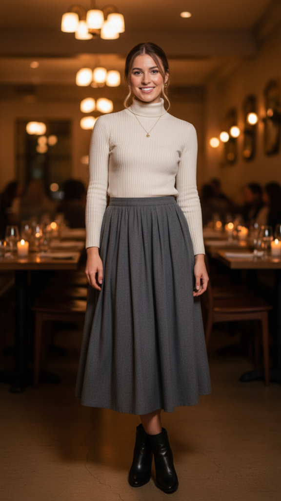 This ensemble couples a fitted turtleneck sweater with a pleated midi skirt and ankle boots, striking an approachable yet polished balance. Coordinating colors such as cream and navy or burgundy and black work beautifully together for a harmonious look.