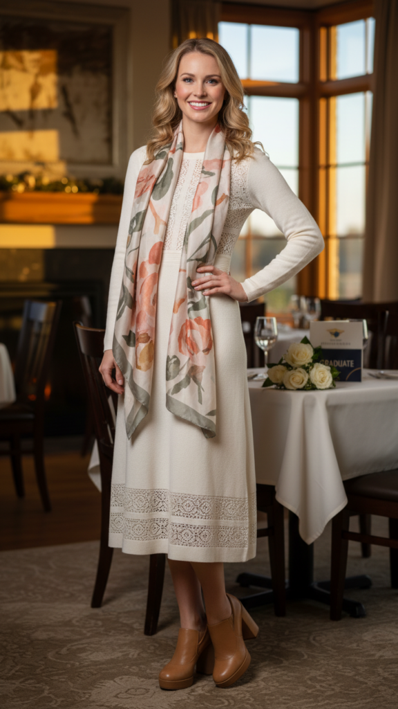 A midi knit dress layered with delicate lace accents unites comfort with polished styling, making it an excellent choice for a graduation dinner. Avoid bulky knitwear in favor of smooth, form-flattering designs paired with a lightweight silk or chiffon scarf to add sophisticated texture.