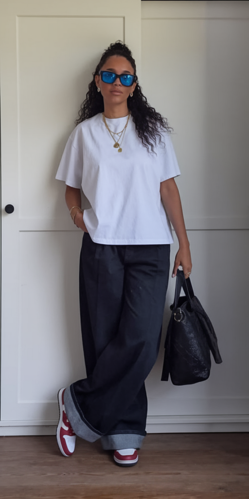 Street style continues to influence summer fashion with exciting blends of comfort and sharp tailoring. This look combines an oversized white tee with relaxed wide-leg denim jeans featuring a neat cuffed hem for structure. Bright red and white chunky sneakers inject energy and fun, while subtle luxury accessories and bold tinted glasses complete the ensemble.