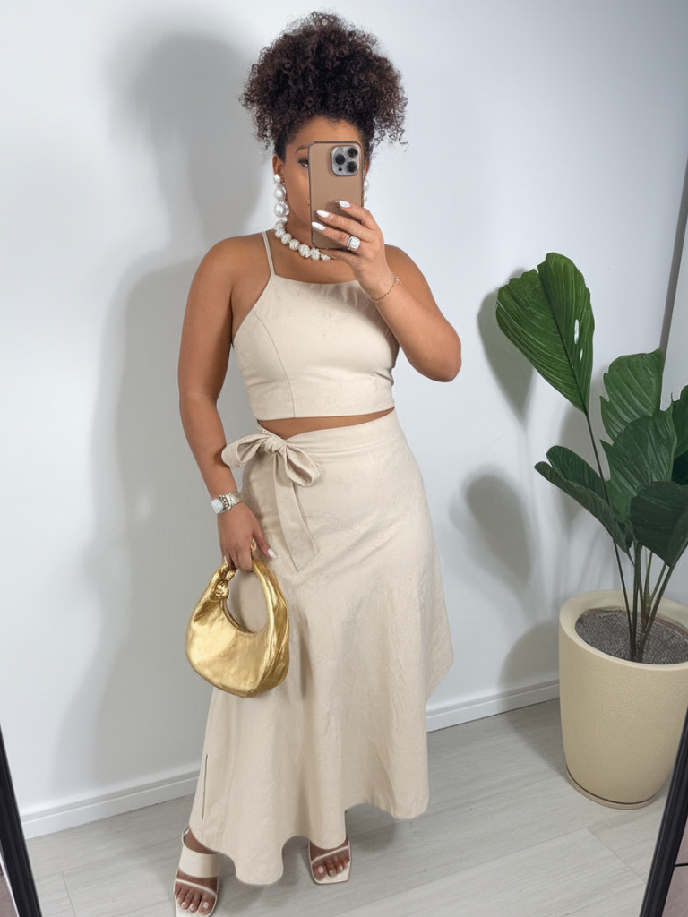 Modern and feminine, matching sets continue to dominate summer fashion. A cream-colored cropped top and wrap-around skirt combination presents a sculptural silhouette that’s both comfortable and attention-grabbing. Ideal for various social occasions requiring stylish yet easy-to-wear attire.