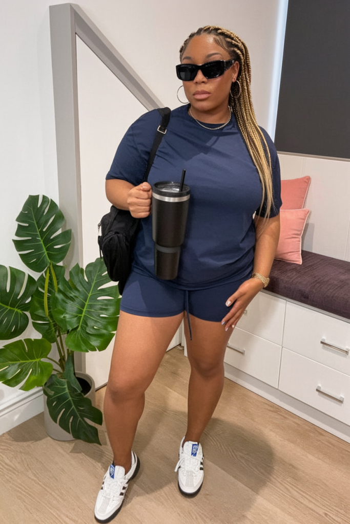 Fusing fashion and function, athleisure remains a top choice for casual summer dressing. A sporty navy two-piece set consisting of a relaxed tee and high-waisted shorts with adjustable drawstrings is versatile enough for gym sessions, errands, or casual social events. Paired with retro-inspired sneakers and glammed-up with subtle gold accents, it strikes the perfect balance.