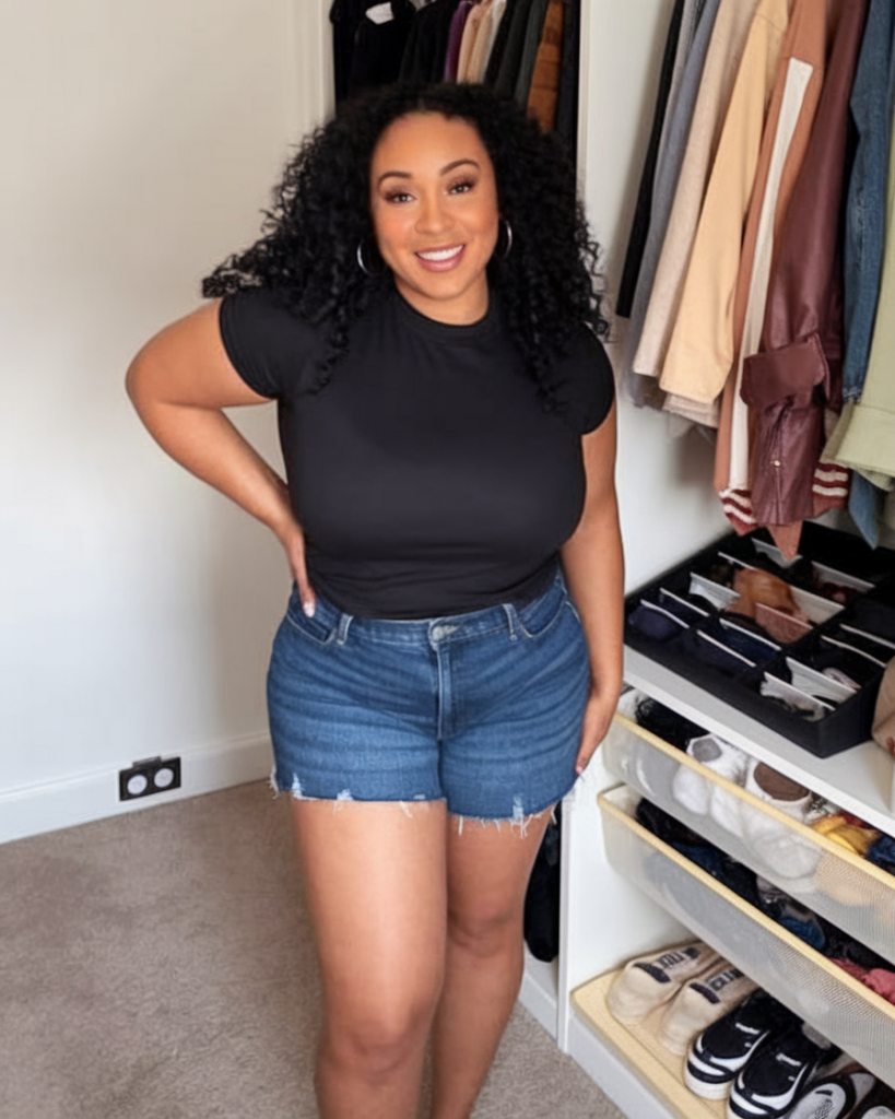 The classic black tee paired with denim shorts remains evergreen for summer wardrobes. This look combines ease with contemporary touches, featuring a fitted black top and high-rise denim shorts that can be personalized for dressy or laid-back occasions.