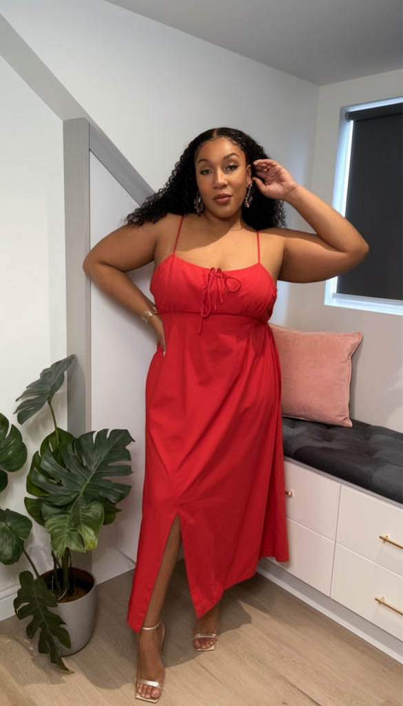 - Red midi wrap dress: Sleeveless with tie accents and subtle slit.