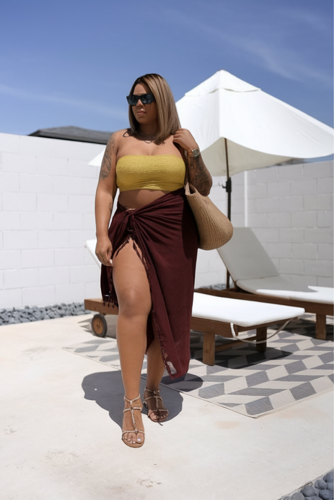 This effortlessly stylish ensemble is designed for Black women embracing their curves by the pool or at the beach. It combines comfort and flair with a strapless yellow bandeau top and a brown sarong tied at the hips for a breezy effect.