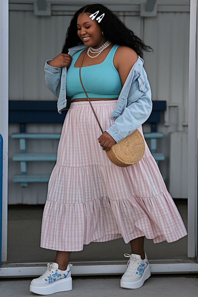 Pastel hues continue making waves in summer collections, especially among Shein options for Black women seeking a blend of comfort and style. A ribbed turquoise crop top paired with a pink gingham tiered midi skirt strikes a delightful balance between femininity and functionality.