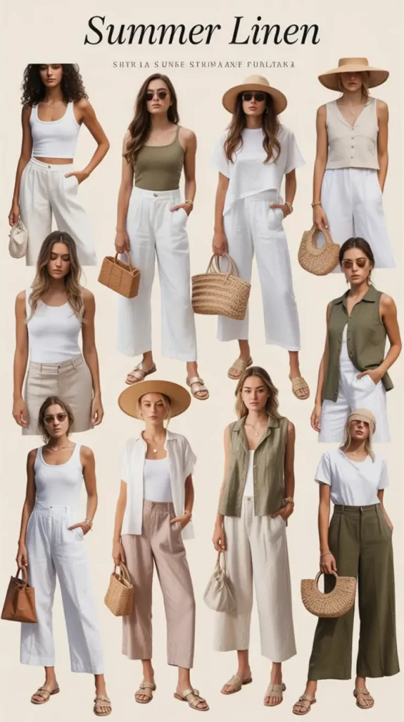 The secret lies in balancing natural textures with sleek accents: breathable fabrics meet structured accessories and minimal jewelry. Each outfit hints at a seamless work-vacation transition.
