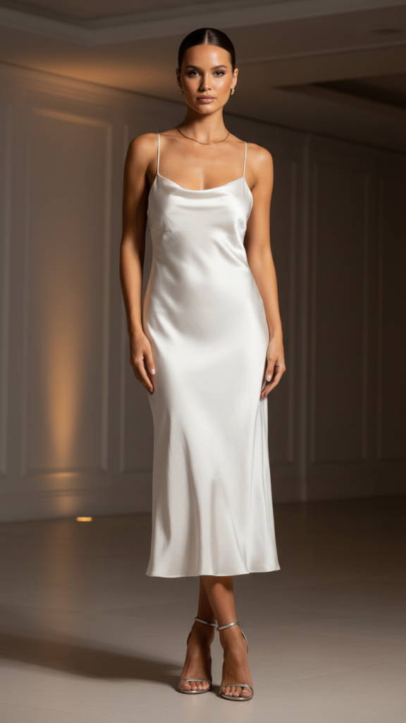 Nothing quite embodies elegance like a silk slip dress in white—it truly elevates everyone’s look to goddess status. The way the silky fabric shimmers in the light, skims curves, and sways smoothly with your steps is enchanting. This outfit choice blends timeless appeal with modern charm.