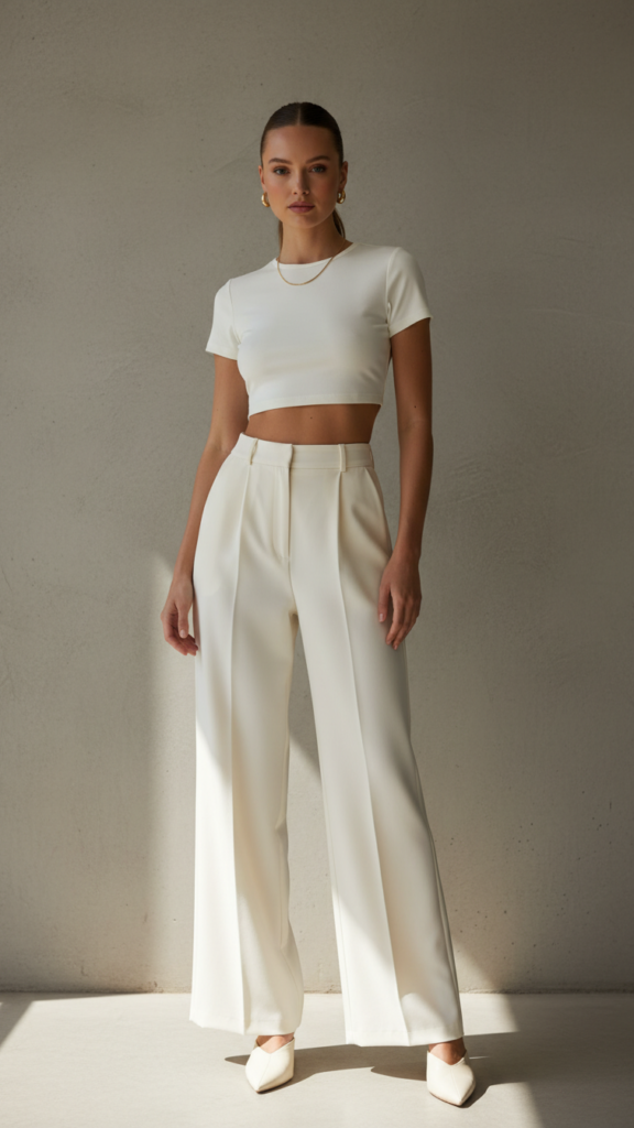 For those who want a look that’s polished yet subtly daring, pairing high-waisted wide-leg trousers with a sleek crop top is the perfect solution. The trousers create an elongated leg line, while the form-fitting crop top introduces balance and structure, keeping the ensemble fresh and modern.