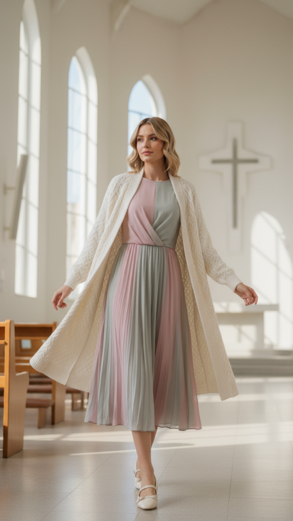 For special church events or evening services, consider a velvet cardigan for an elevated, tactile element that radiates luxury. This duo is versatile, allowing you to shed a layer if indoor heating kicks in. Complete the look with closed-toe loafers or low-heeled boots to ensure all-day comfort without sacrificing style. This cozy cardigans and midi dress pairing offers a perfect blend of warmth and grace.