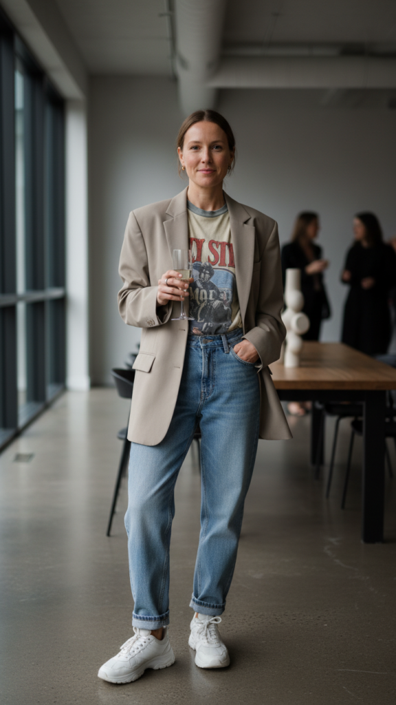 The oversized blazer layered over a statement tee is the ultimate shortcut for a pulled-together look when you’re actually feeling far from organized. Grab a baggy blazer—preferably one that doesn’t scream “business meeting”—and style it over a cool vintage band shirt or graphic top, paired with relaxed-fit jeans.