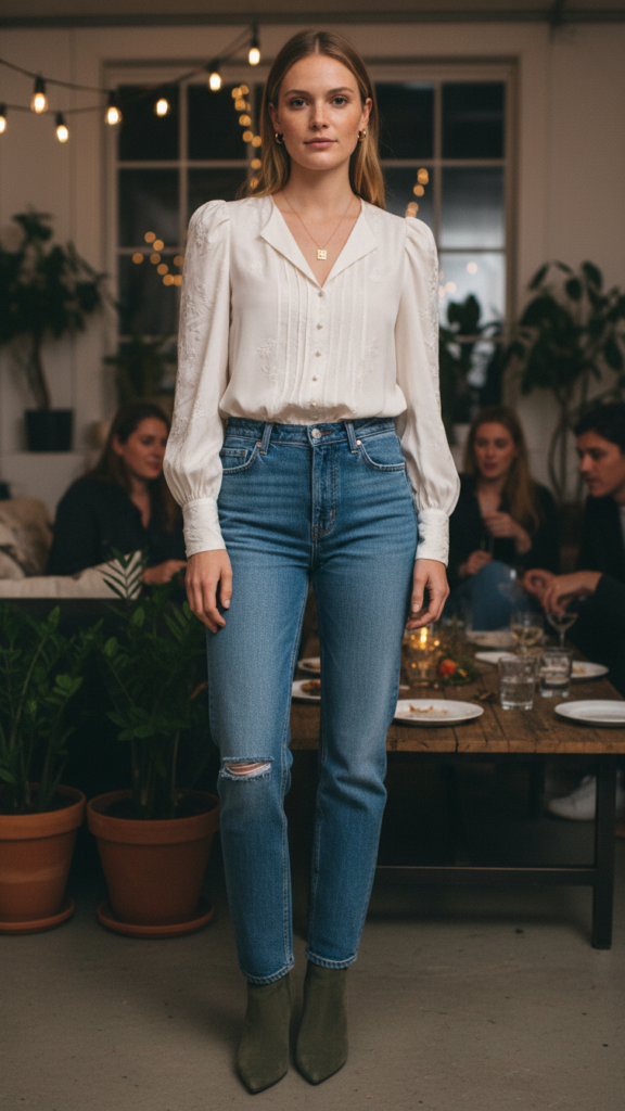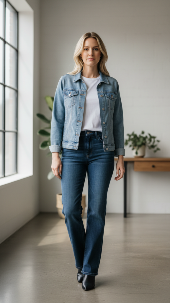 Choose jeans that flatter your shape—high-waisted, straight legs tend to fit most people beautifully. Elevate your top with interesting details like unique sleeve designs, textured fabrics, or subtle embellishments. Accent with standout earrings and shoes that balance style and comfort.