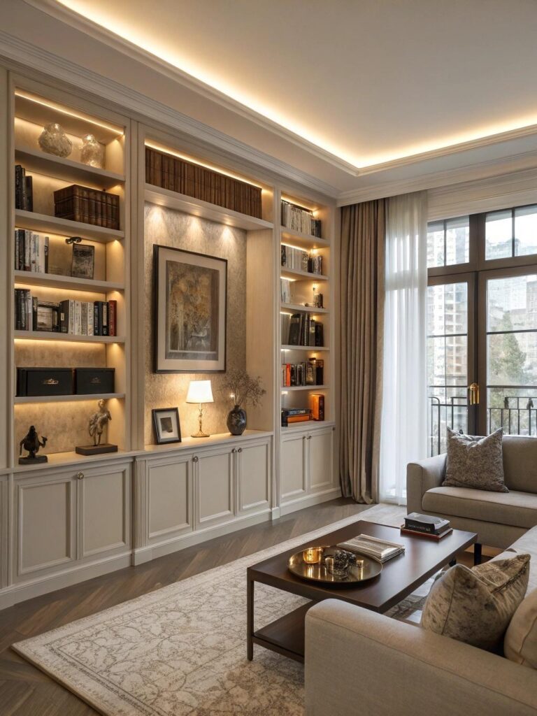 Enhance visual interest by installing subtle shelf lighting to spotlight prized possessions. Custom built-ins are practical luxuries that create a harmonious, organized environment.