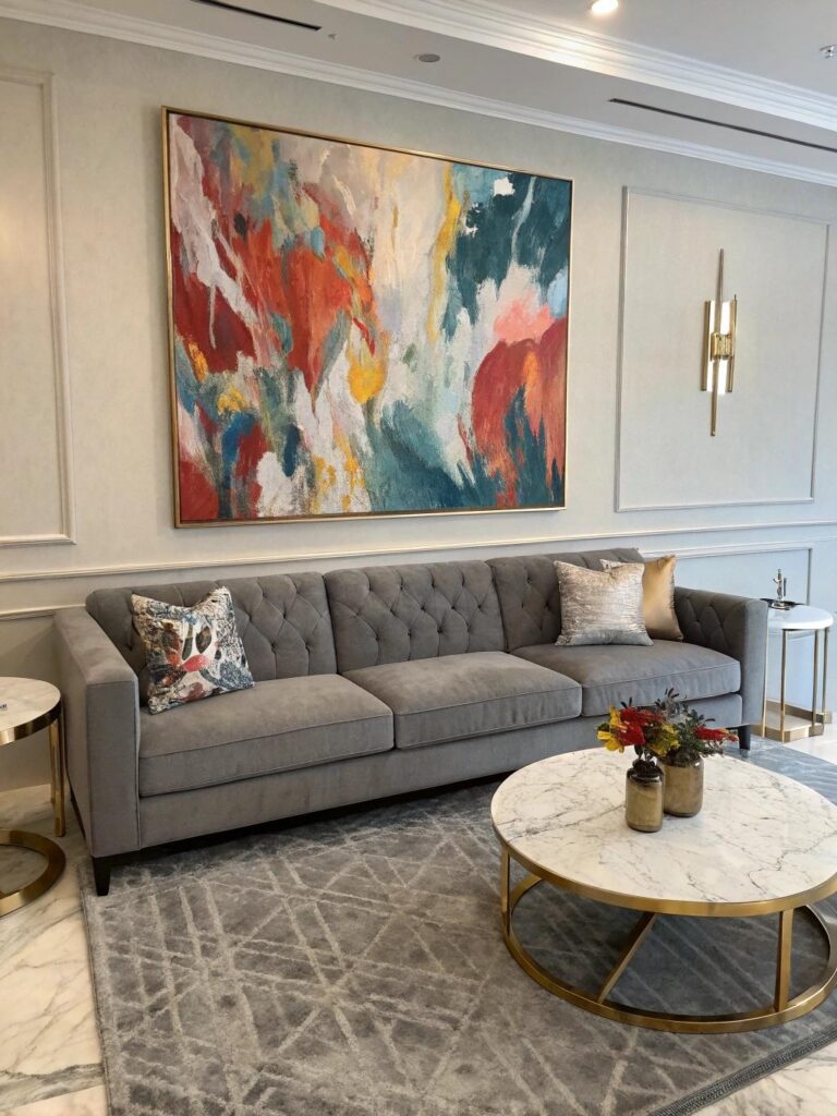 Choose impactful large artworks or curated gallery walls that compliment your room’s palette and design ethos.