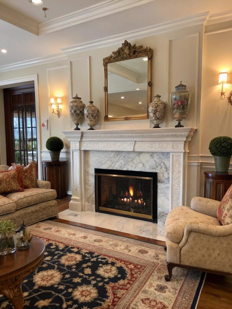 Style the mantel with select artwork, mirrors, or curated decorative objects to anchor the room’s atmosphere. It’s a classic luxury element that invites comfort and elegance.