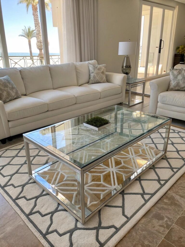 Incorporate sleek glass surfaces such as coffee or side tables to create an airy and modern atmosphere. Their transparency adds to the open feel and reflects natural lighting beautifully.