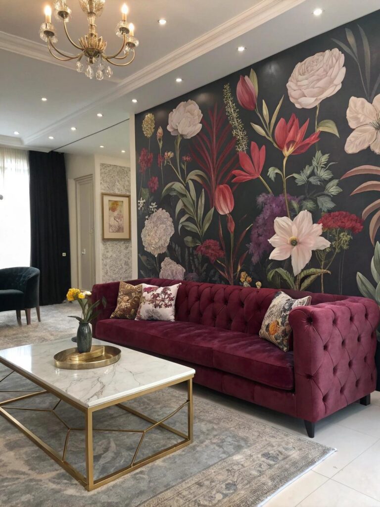 Daring wallpaper choices can entirely redefine your living area. Opt for patterns ranging from lush botanical designs to sharp geometrics or intricate damask motifs for grand visual impact. Feature an accent wall or envelop the space for a bold statement.