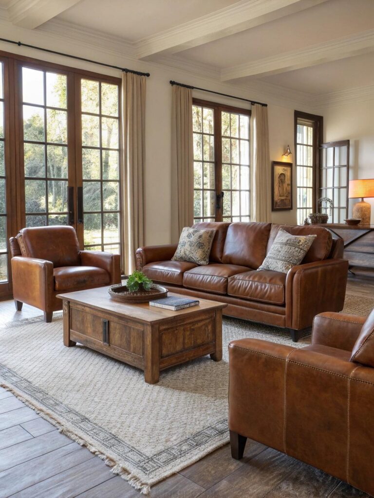Leather uniquely evolves with time, developing character and depth. Pairing it with soft materials such as velvet cushions or wooden accessories creates a harmonious and inviting space.