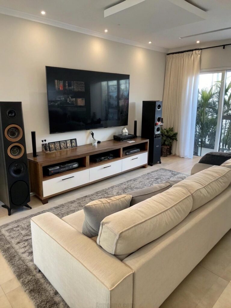 Keep cables and devices neatly concealed for a sleek appearance. Designate an inviting media lounge with plush seating, perfect for hosting movie nights or gatherings—a truly upscale living room addition.