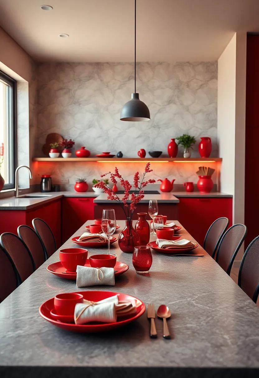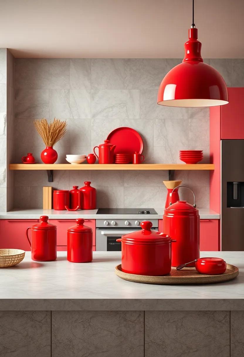 - Accessories: Use red kitchen utensils, dishware, or decorative items to add pops of color.