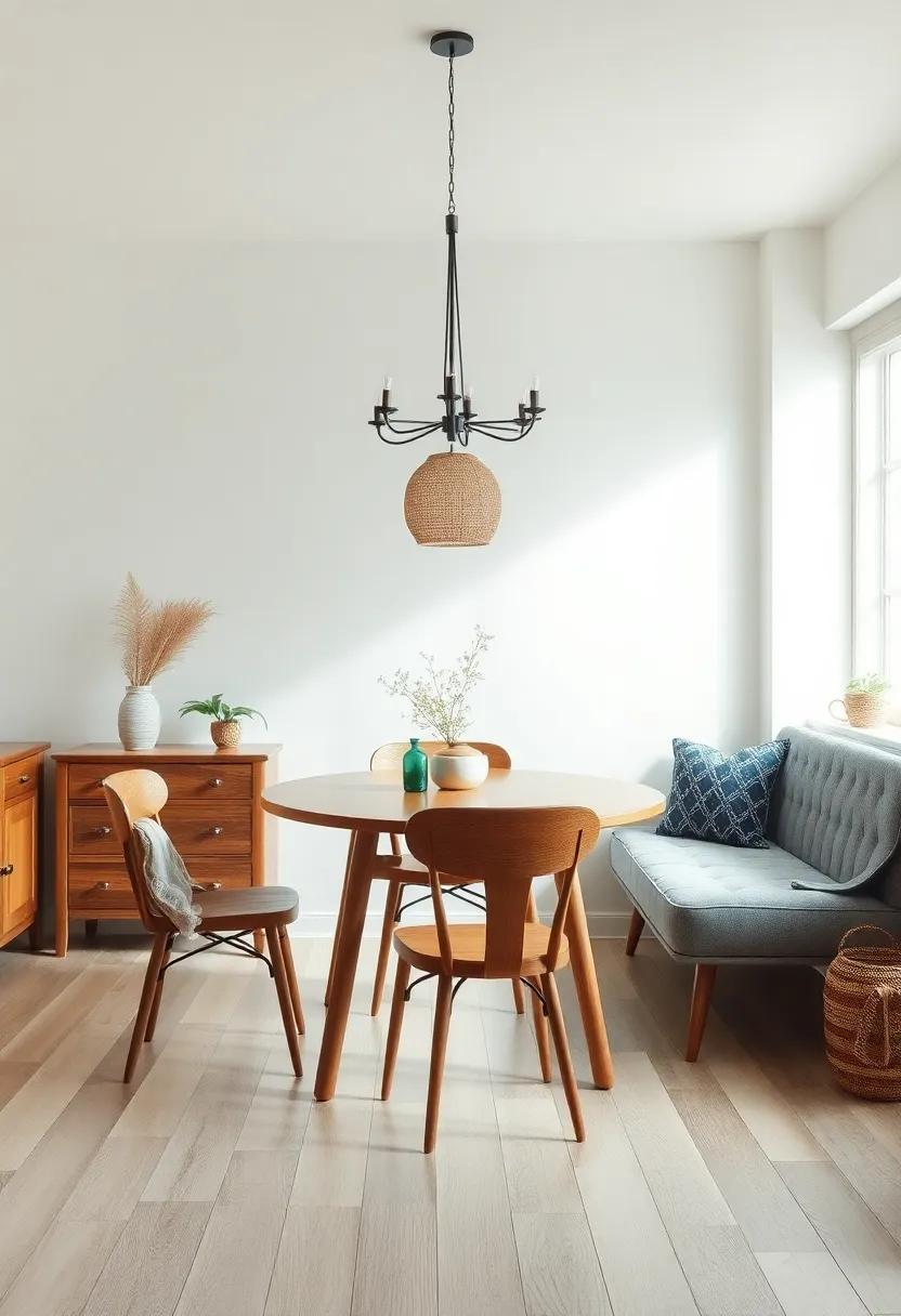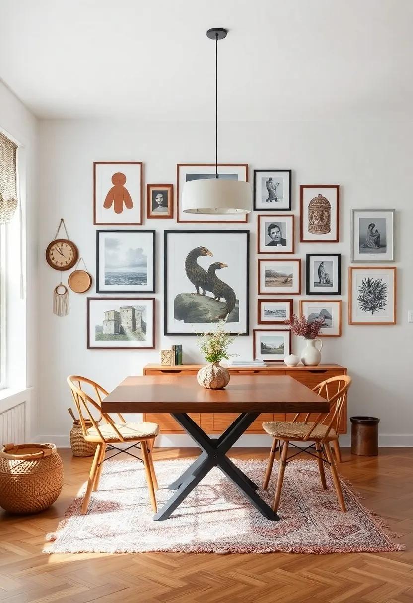 Art is another essential element in accentuating your eclectic dining space. Hang a vintage tapestry on one wall while showcasing modern abstract art on another to create a visual dialog. To further enrich the ambiance, consider incorporating a few lush indoor plants—they not only improve air quality but also seamlessly blend with both vintage and contemporary aesthetics. Use colorful, patterned cushions on your chairs to infuse personality and comfort. Remember, the key lies in balancing styles and allowing pieces to complement rather than compete, resulting in a dining room that feels both curated and spontaneously charming.