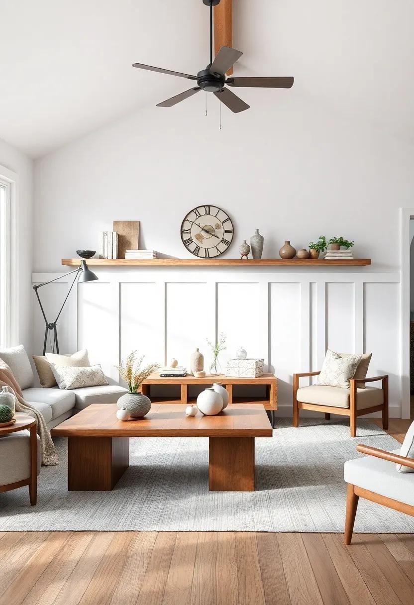 Arranging your seating around a wooden coffee table is crucial for fostering meaningful connections. Think beyond the conventional layout; embrace asymmetry and casual arrangements. Position sofas and chairs in a circular formation to promote inclusivity, allowing everyone to lean in towards the center. Incorporate pleasant cushions to soften the space and invite relaxation. You can also create small conversation pods by using mismatched chairs or poufs that echo the farmhouse’s rustic charm, encouraging guests to move freely and engage in intimate dialogues.