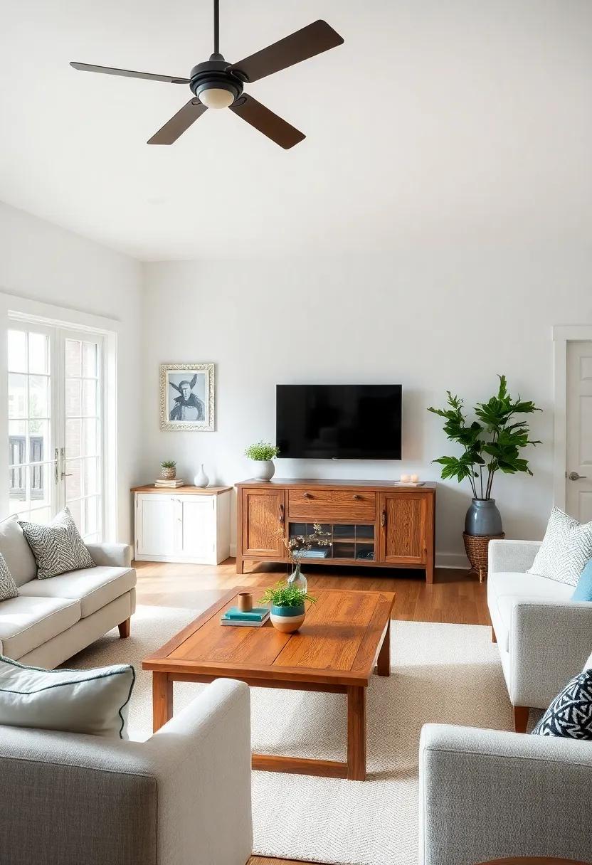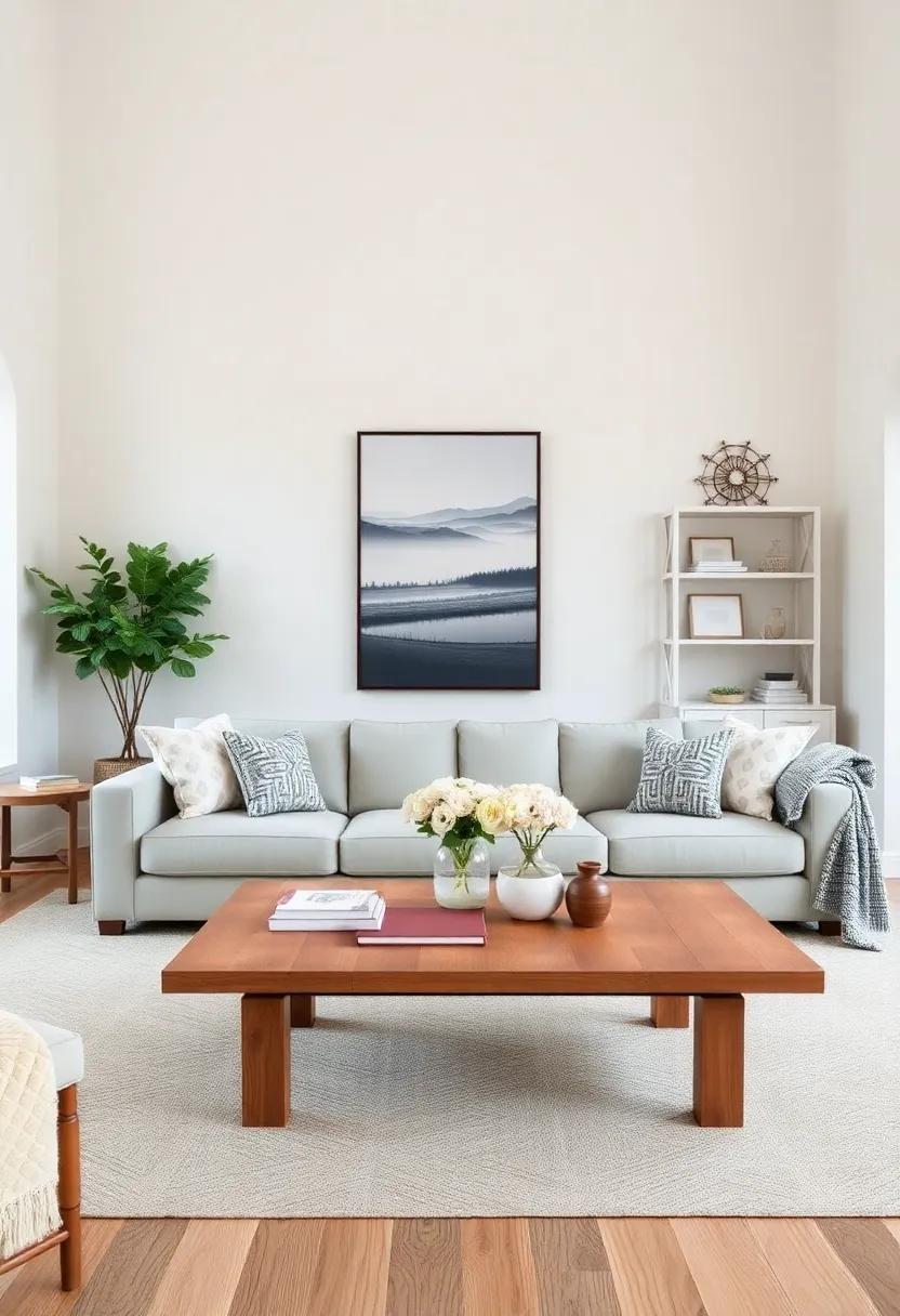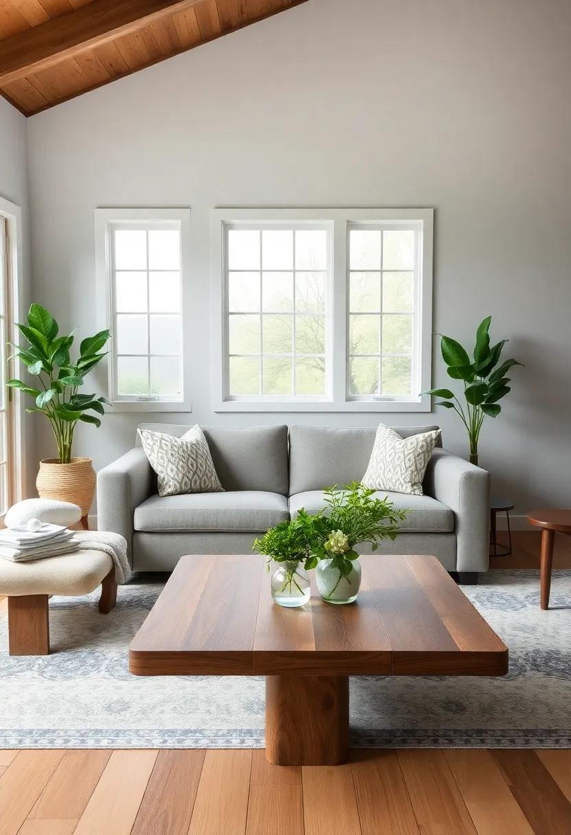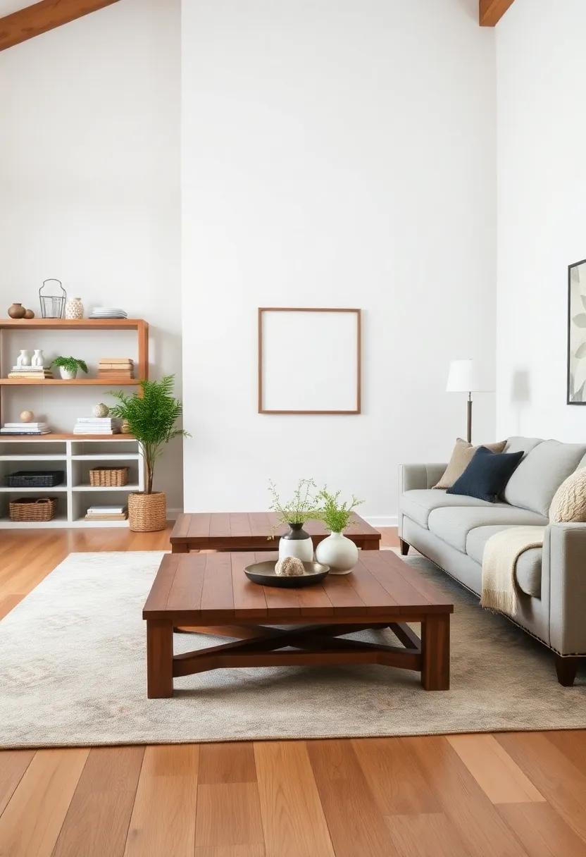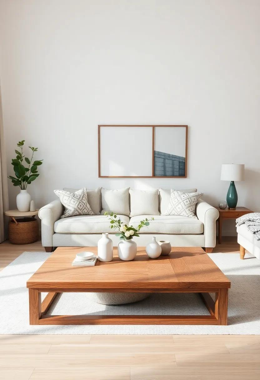 Your wooden coffee table can become a stunning centerpiece when adorned with greenery. Consider a layered approach where you feature a combination of small potted plants alongside decorative items. This brings warmth and vibrancy to the space while maintaining a cohesive look. Here’s a simple arrangement idea: