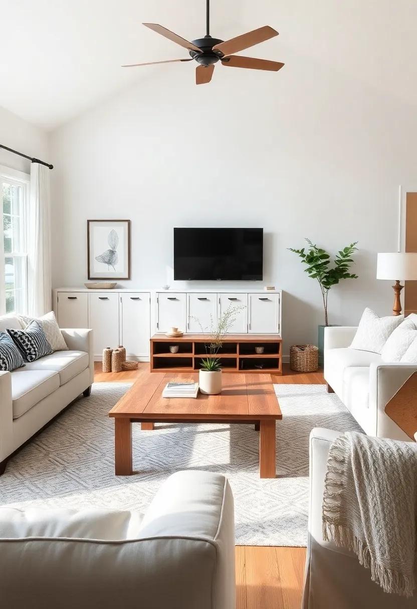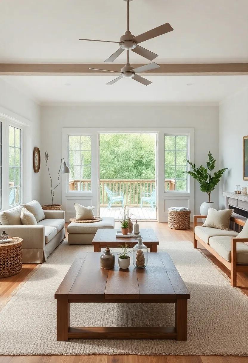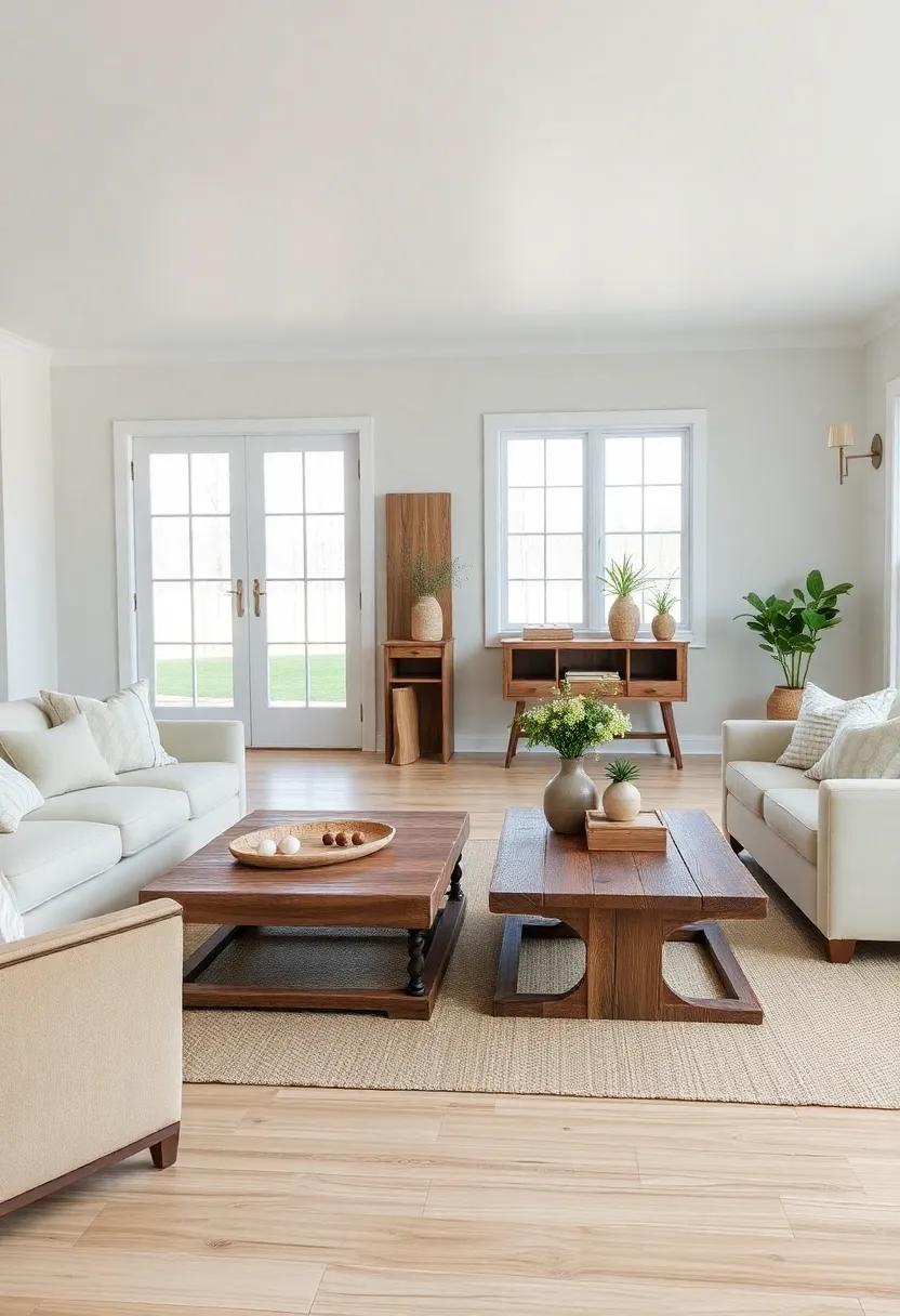 Arranging your seating around a wooden coffee table is crucial for fostering meaningful connections. Think beyond the conventional layout; embrace asymmetry and casual arrangements. Position sofas and chairs in a circular formation to promote inclusivity, allowing everyone to lean in towards the center. Incorporate pleasant cushions to soften the space and invite relaxation. You can also create small conversation pods by using mismatched chairs or poufs that echo the farmhouse’s rustic charm, encouraging guests to move freely and engage in intimate dialogues.