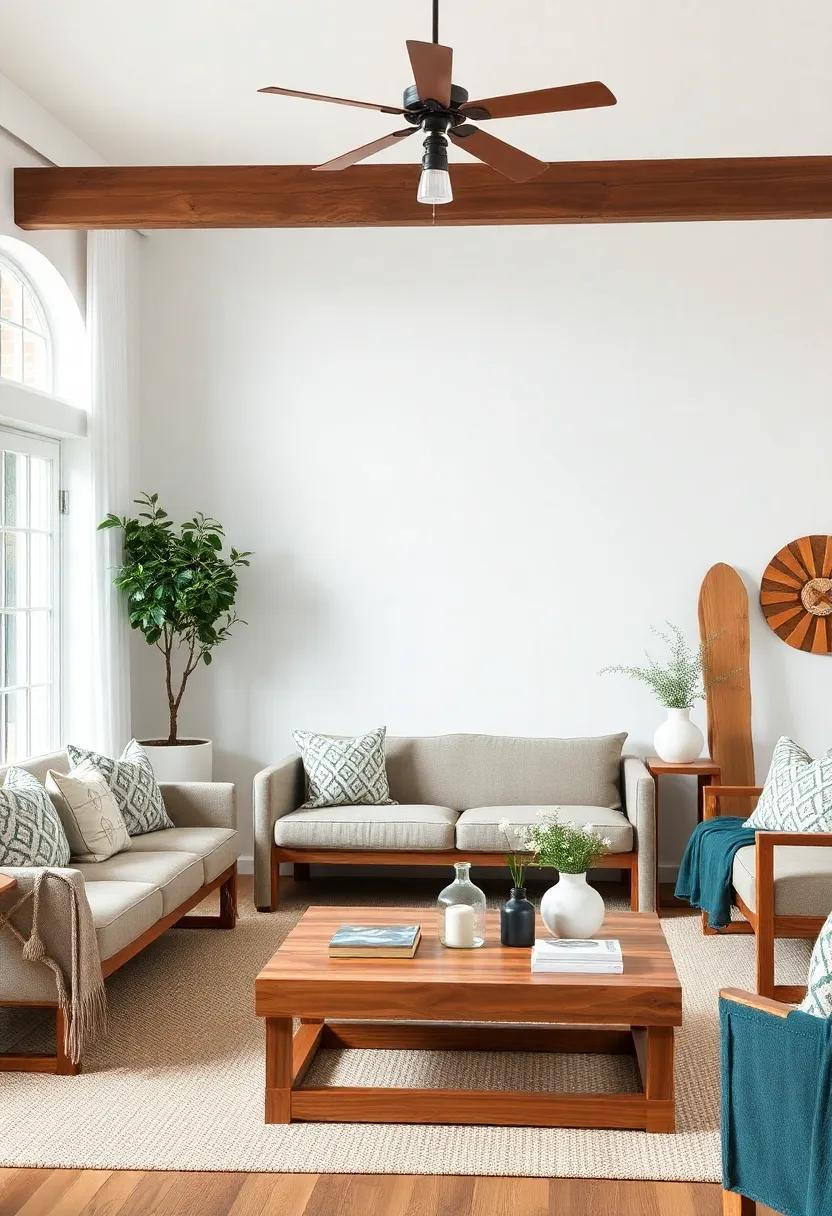 To highlight the beauty of your wooden coffee table, arrange the surrounding decor thoughtfully. An inviting setup might include a few carefully chosen accessories such as: