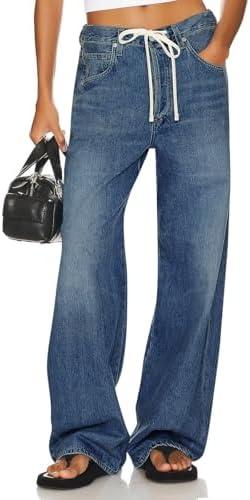 PLNOTME Womens Baggy Wide Leg Jeans Boyfriend Drawstring High Waisted Mom Denim Pants with Pockets