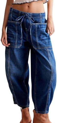Mid Rise Barrel Jeans for Women with Drawstring & Pockets