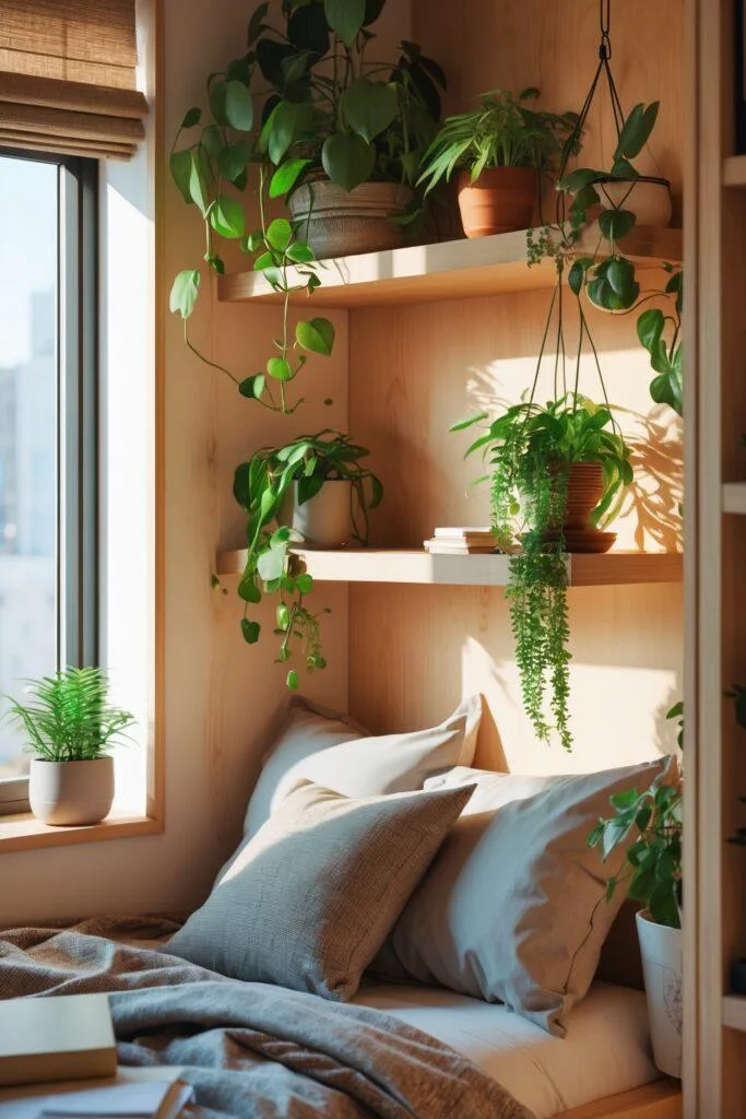 - Adorn corners with hanging planters for fresh greenery without footprint.