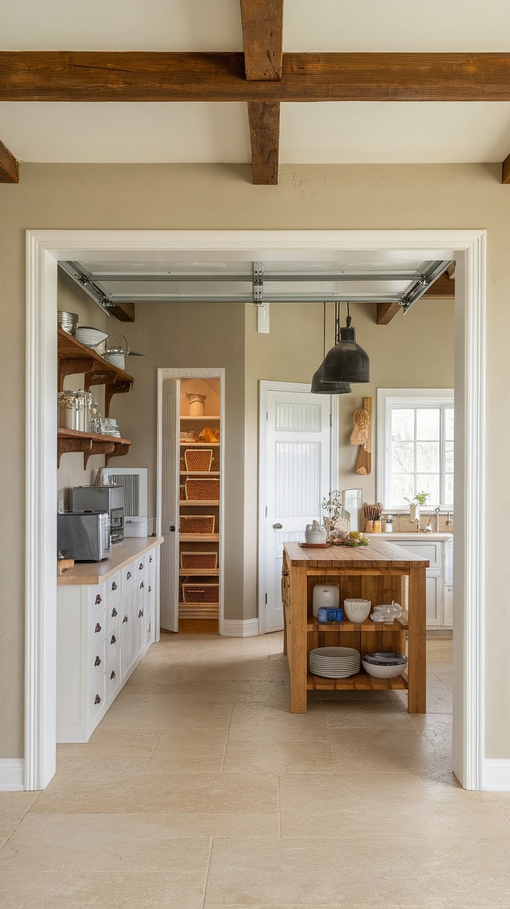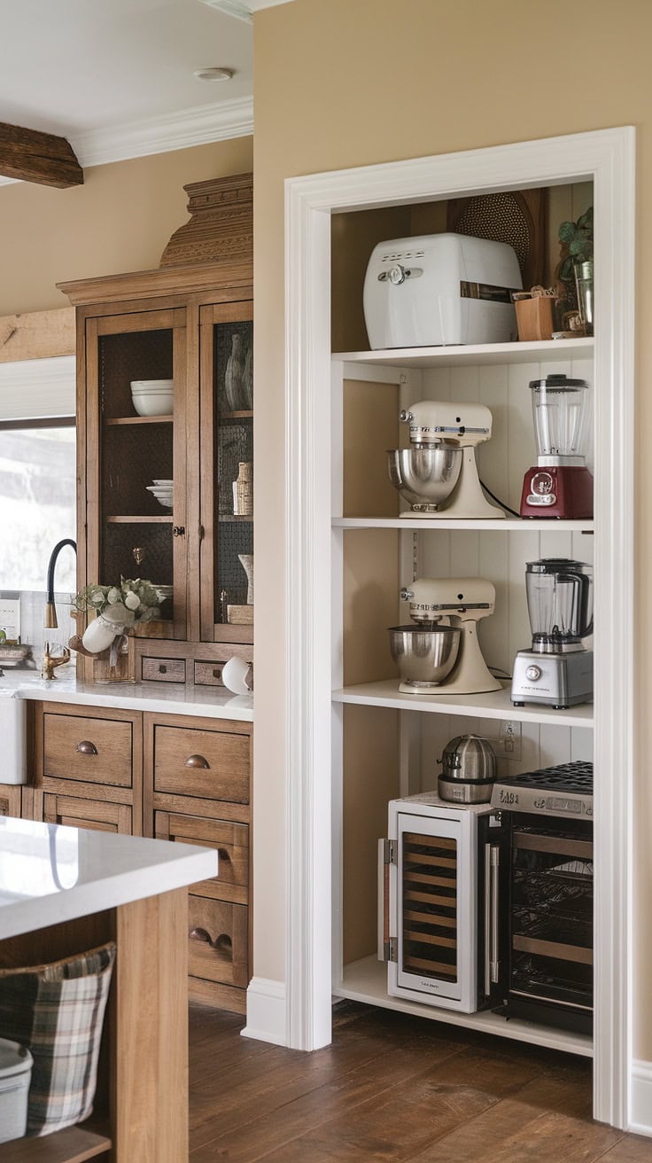 This farmhouse kitchen integrates a dedicated appliance garage with plentiful shelving and pantry cabinetry, ensuring counters stay neat. The fluid transition from kitchen to garage reveals an expertly planned rustic kitchen interior that maximizes utility.