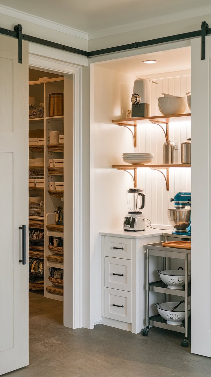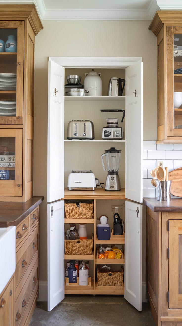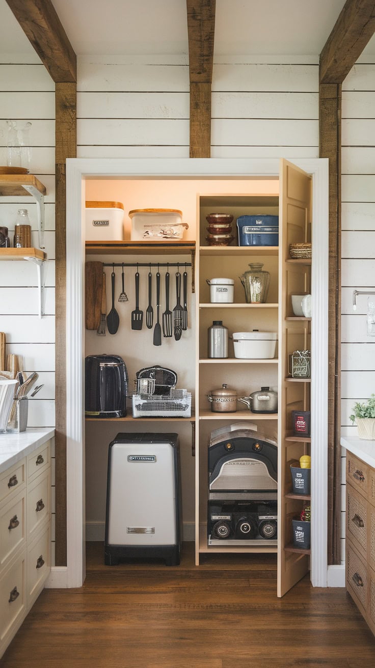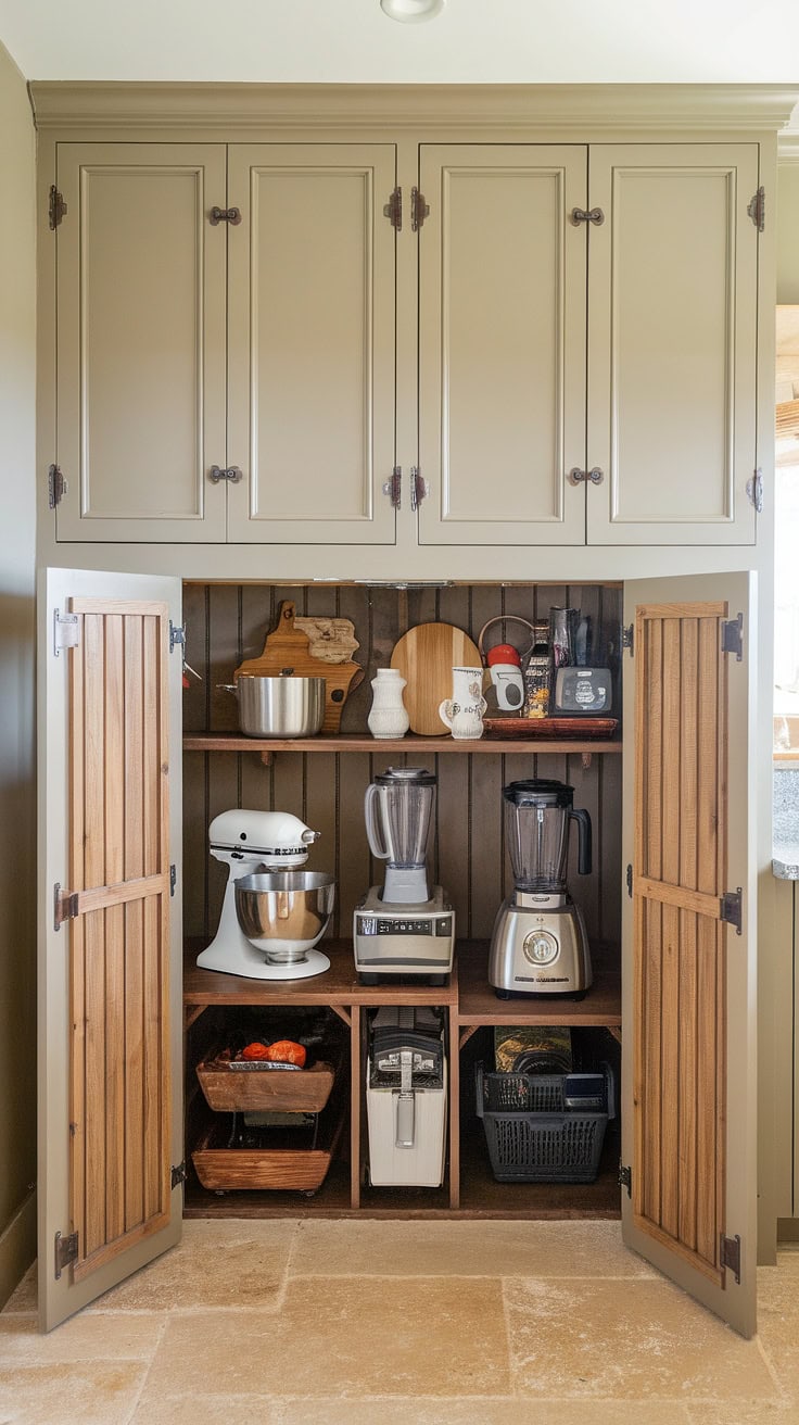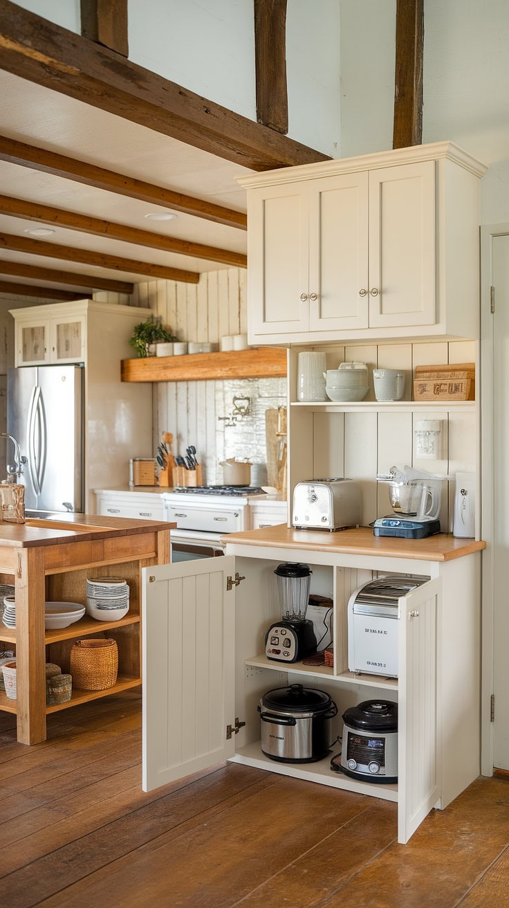 Blending rustic farmhouse charm with modern practicality, this kitchen garage and appliance storage unit keeps everything out of sight, complemented by ample pantry cabinetry to ensure a flawlessly organized cooking space.