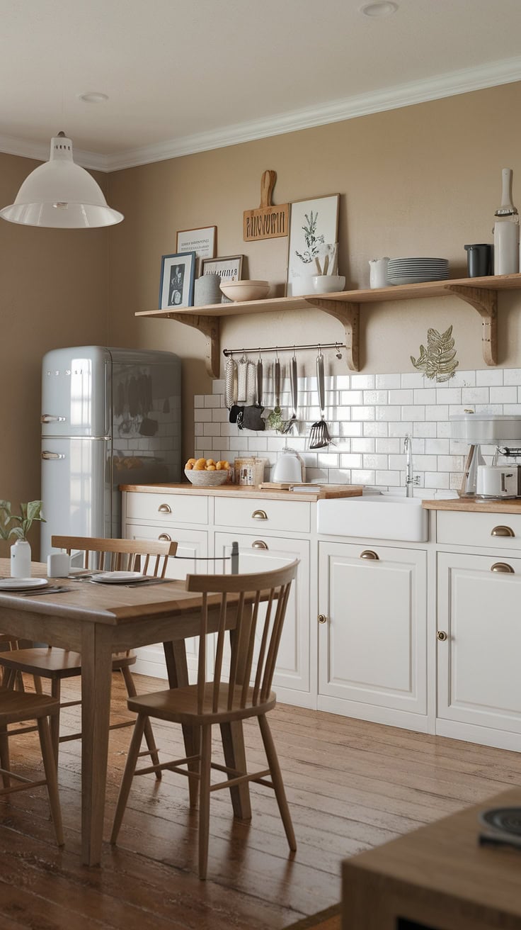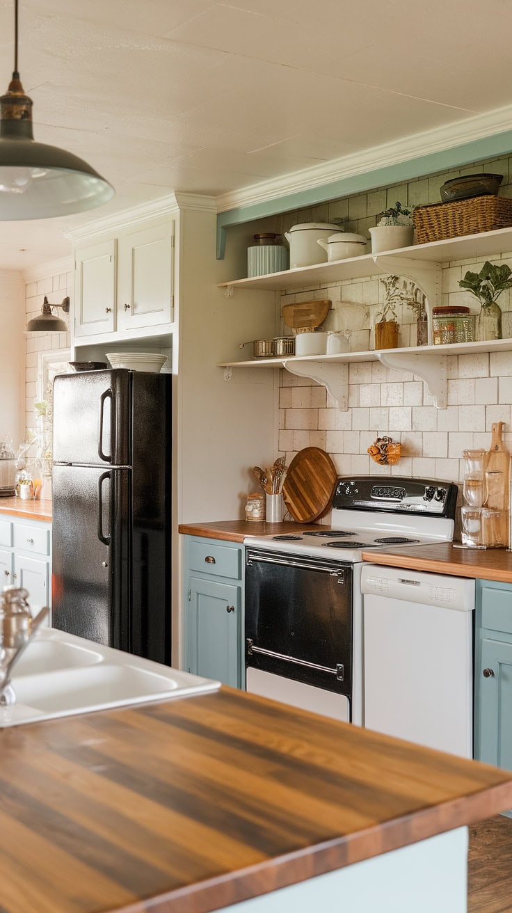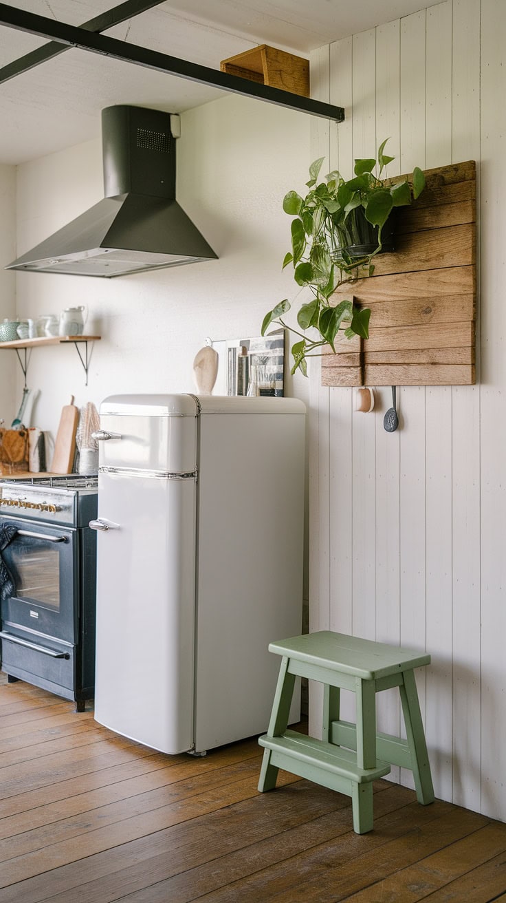 Appliances discreetly stored in this farmhouse kitchen’s appliance garage maintain a clean look. A contrast of white fridge and black oven pairs with a green stool and rustic wooden accents, while warm flooring and simple wall hooks finalize this inviting kitchen design.