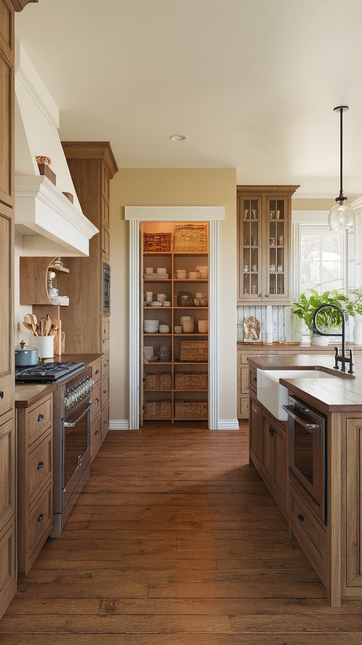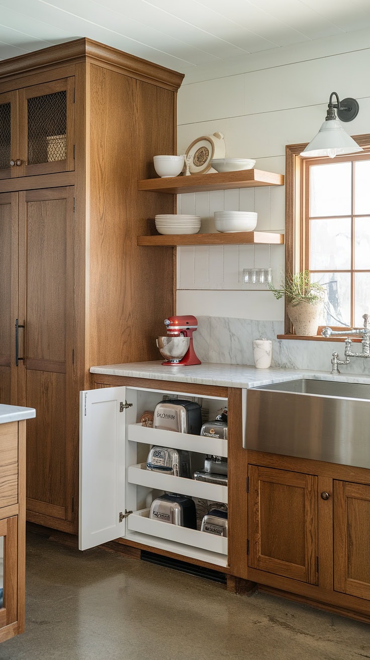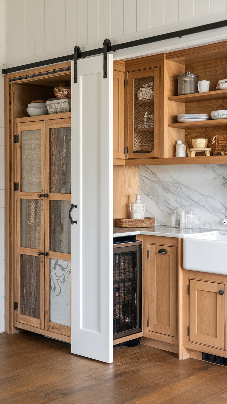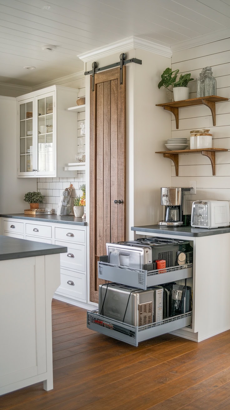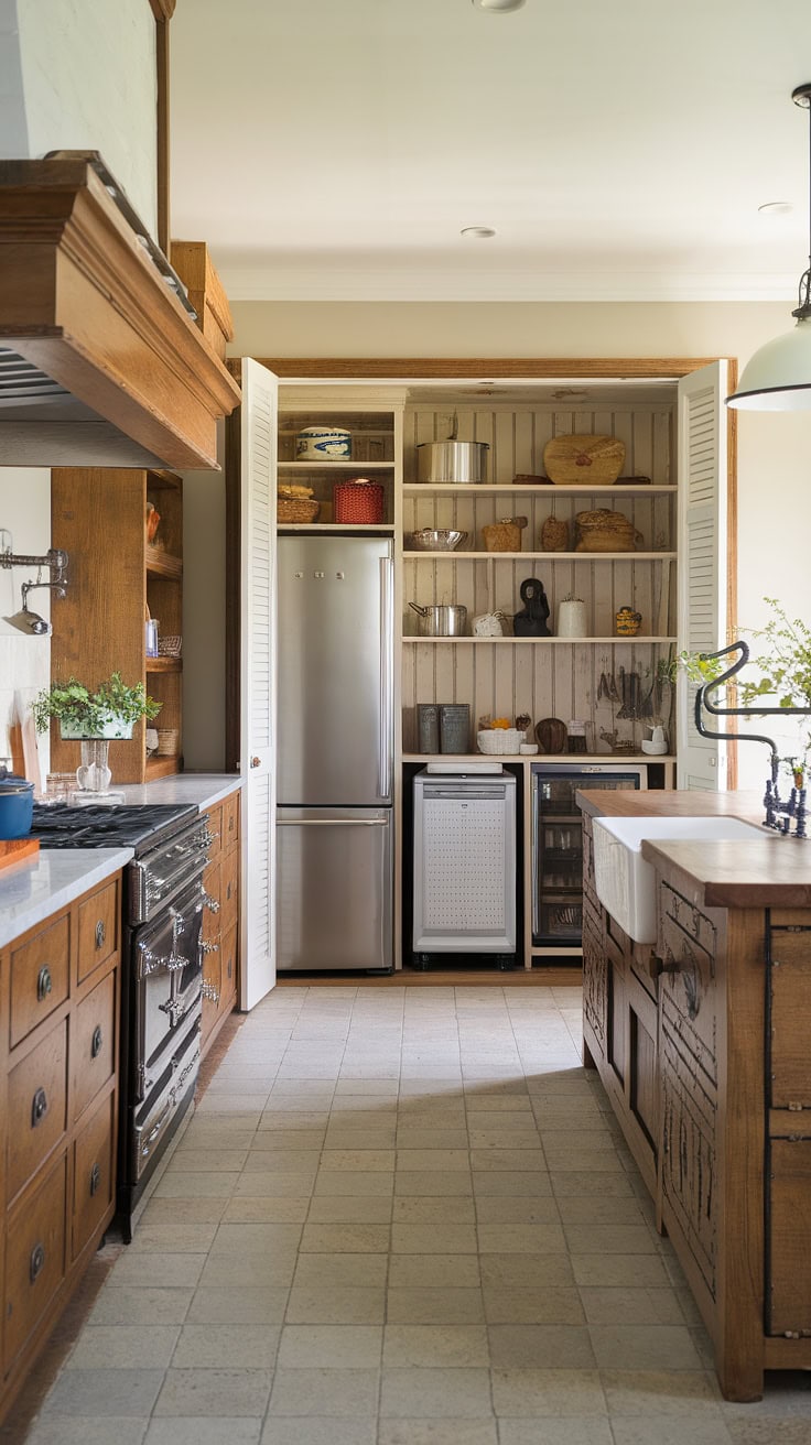 The rustic appeal of farmhouse kitchens meets modern space-saving with a built-in appliance garage and cleverly designed pantry cabinets. This layout dramatically boosts storage while preserving style and warmth.