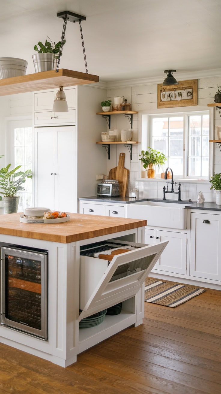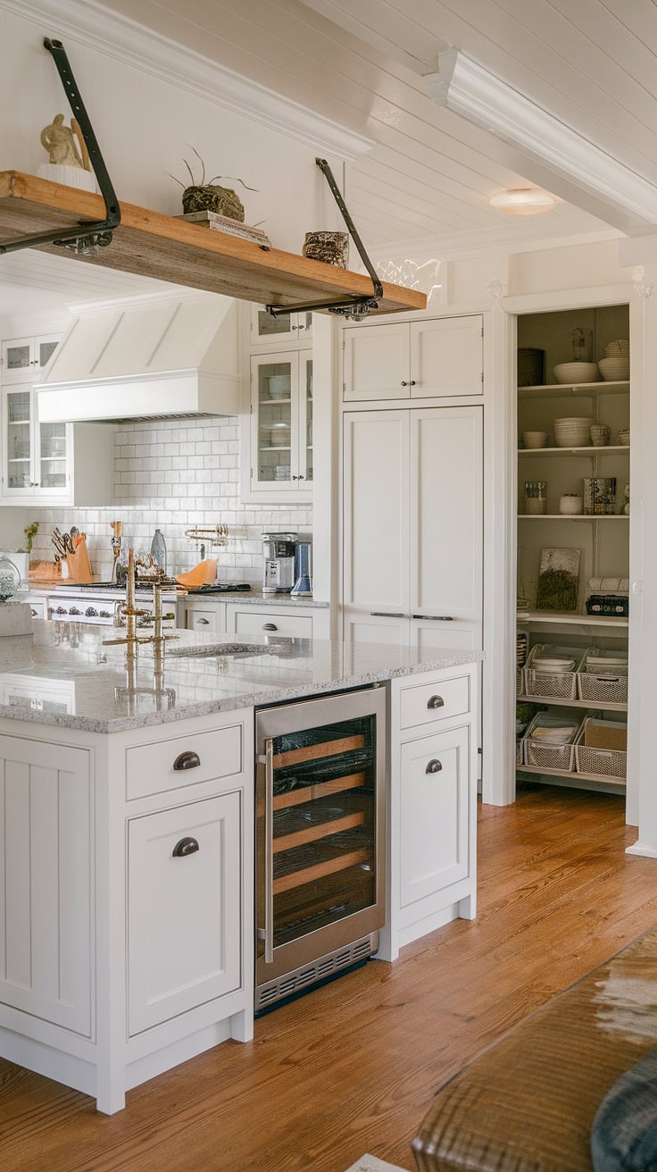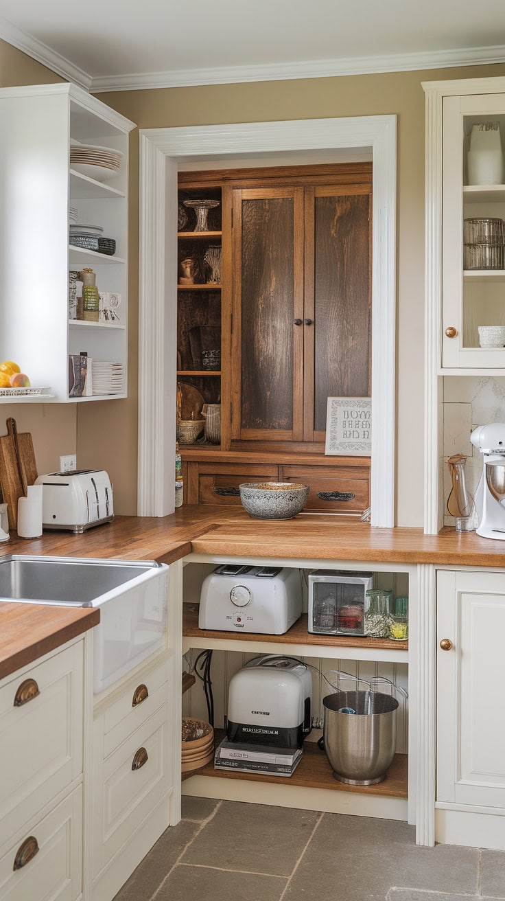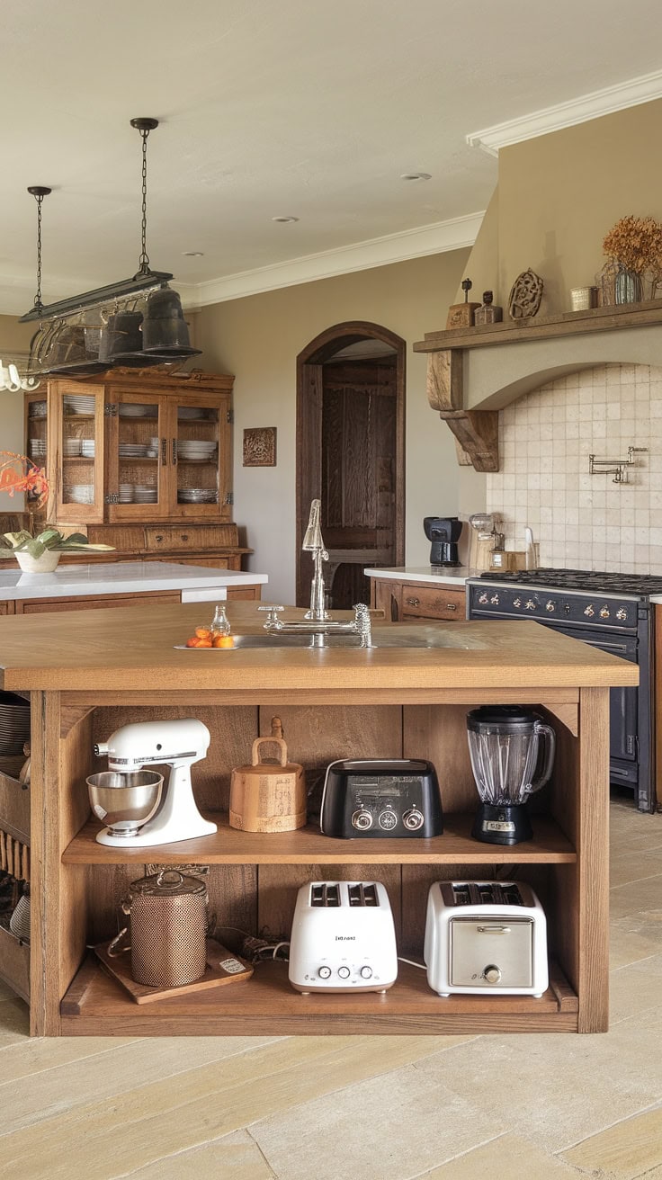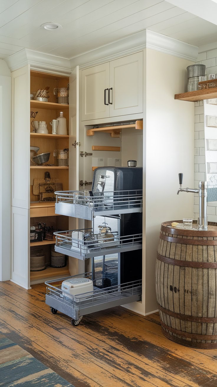 The rustic appeal of farmhouse kitchens meets modern space-saving with a built-in appliance garage and cleverly designed pantry cabinets. This layout dramatically boosts storage while preserving style and warmth.