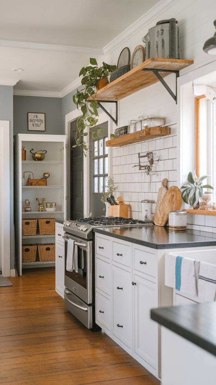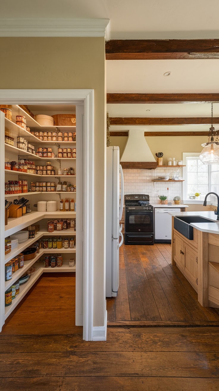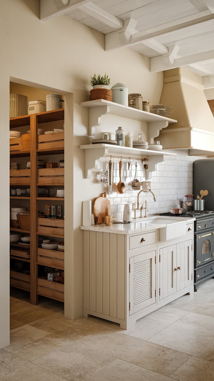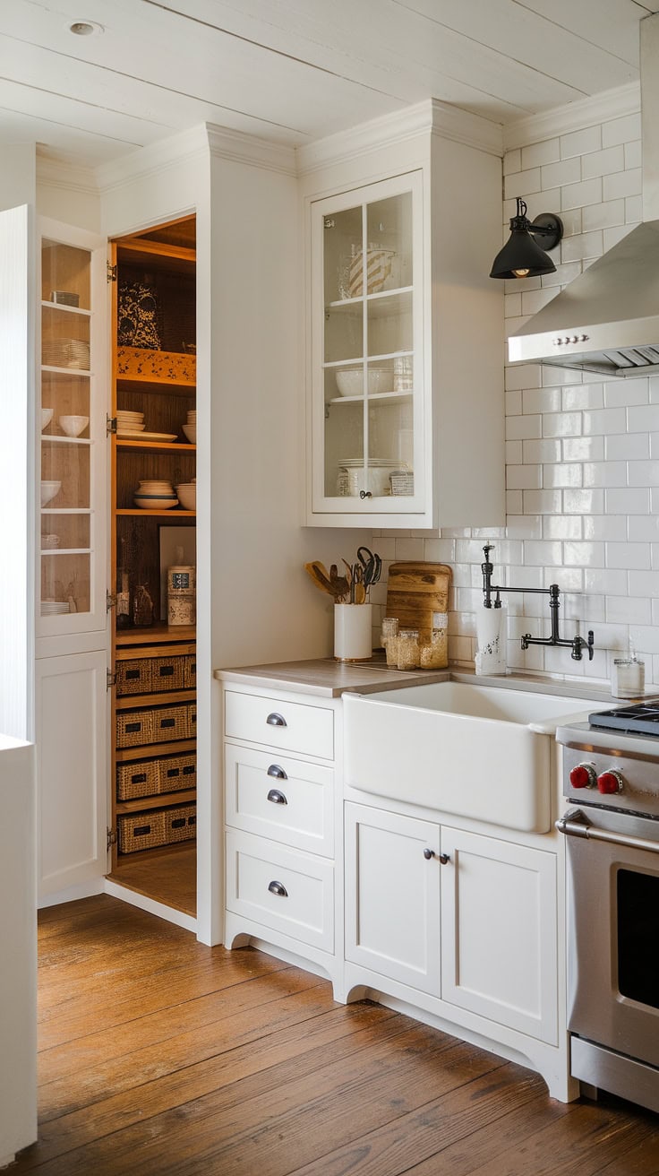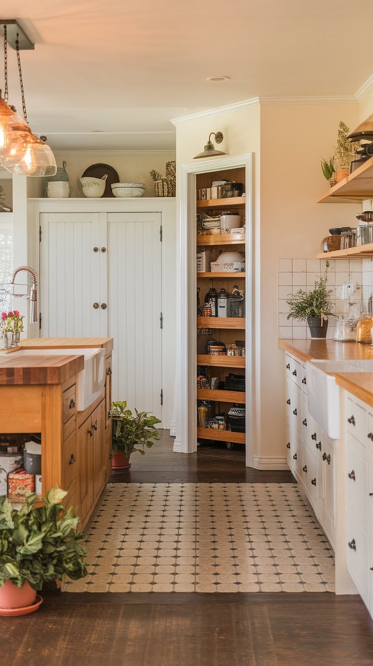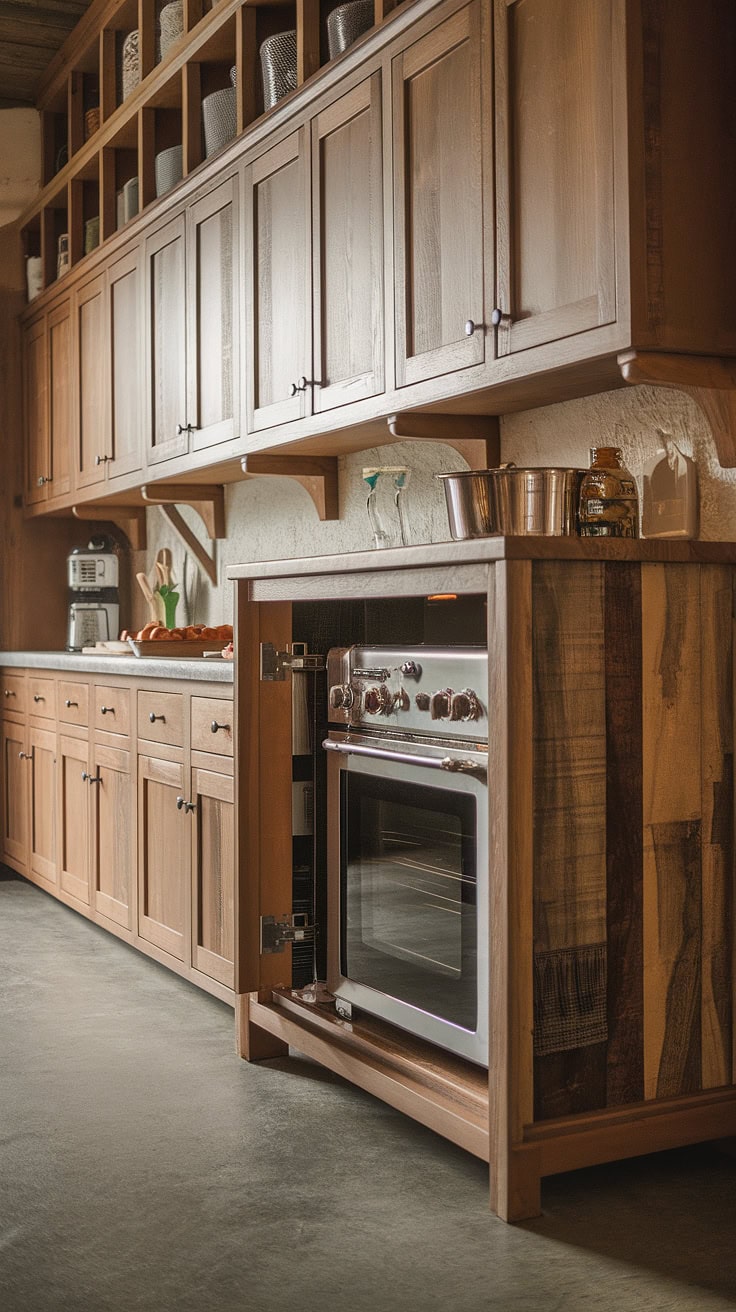 The rustic appeal of farmhouse kitchens meets modern space-saving with a built-in appliance garage and cleverly designed pantry cabinets. This layout dramatically boosts storage while preserving style and warmth.