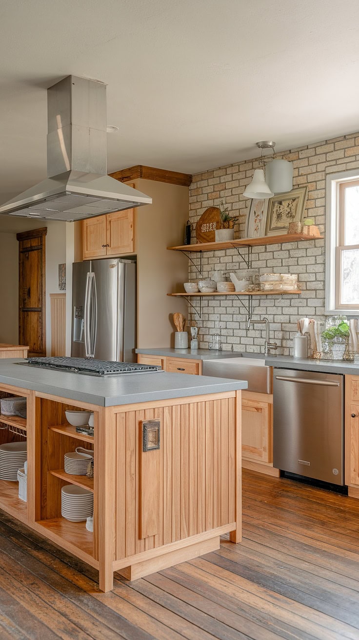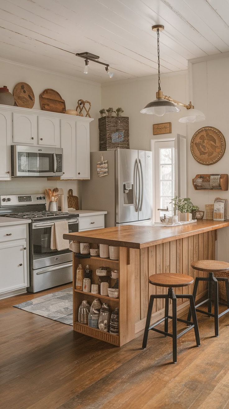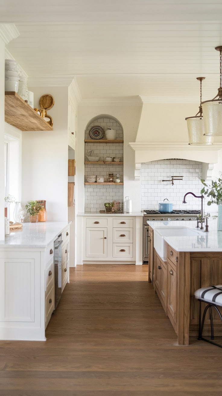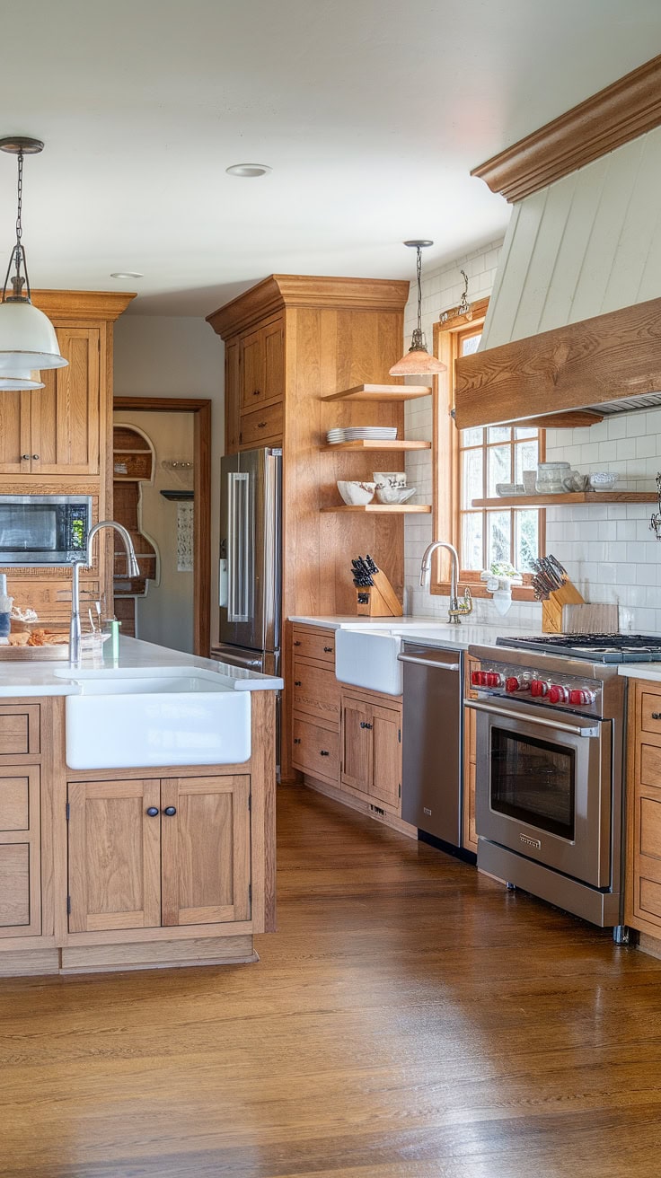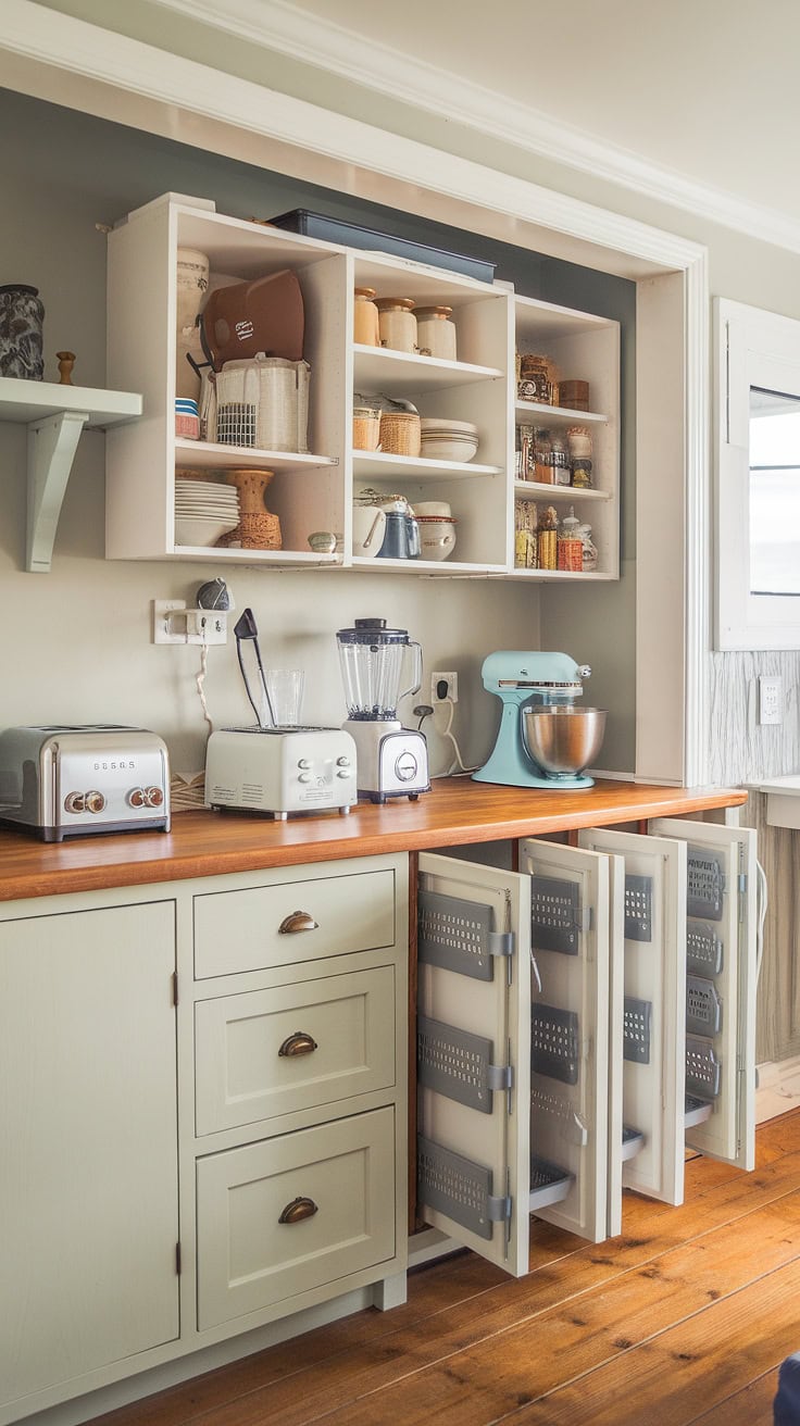 The rustic appeal of farmhouse kitchens meets modern space-saving with a built-in appliance garage and cleverly designed pantry cabinets. This layout dramatically boosts storage while preserving style and warmth.