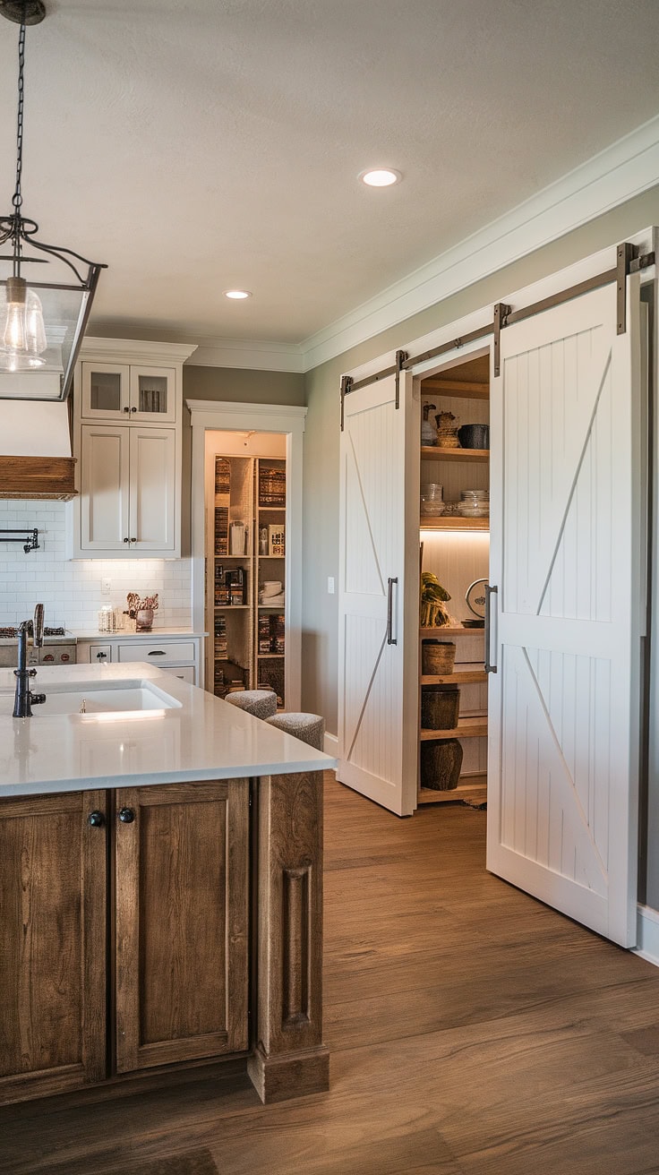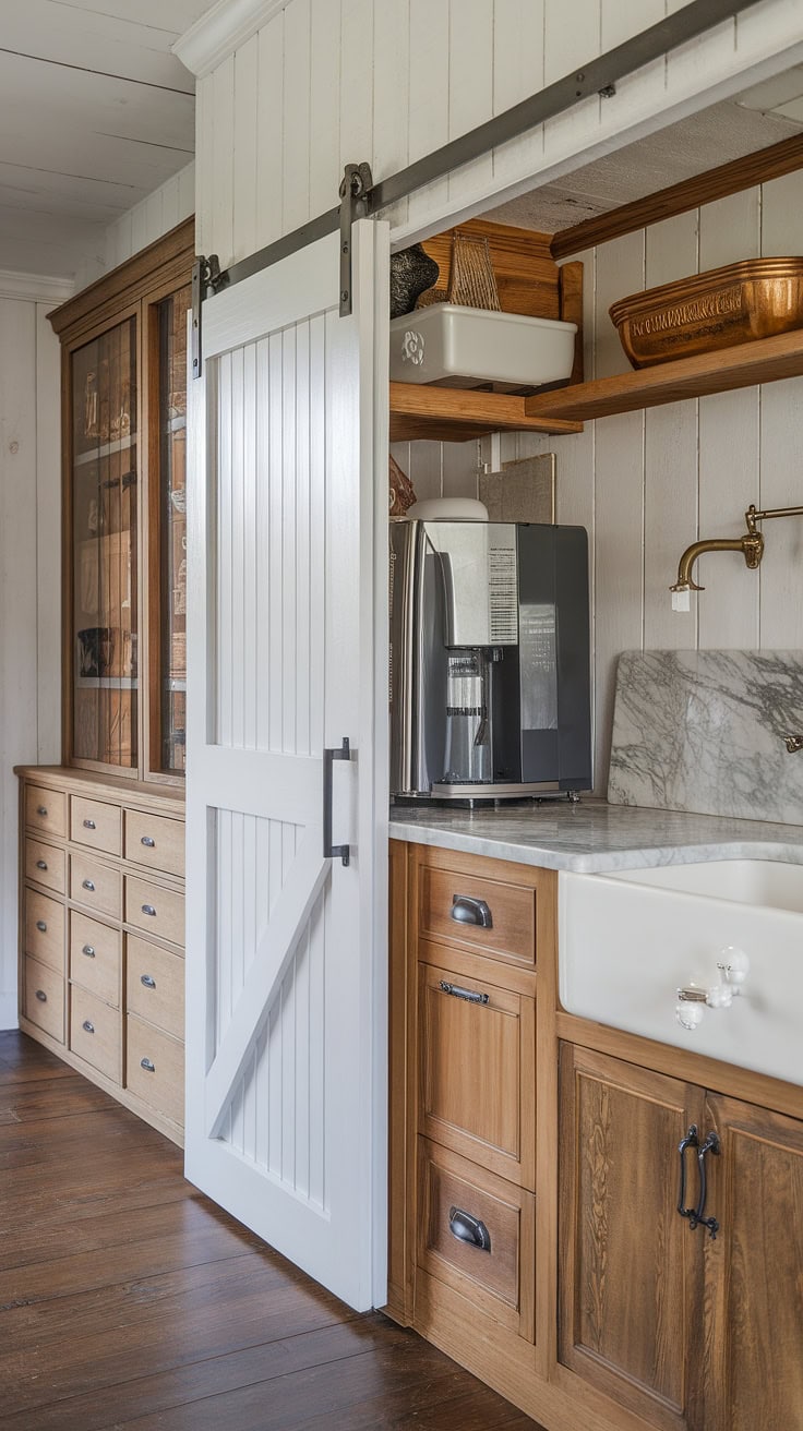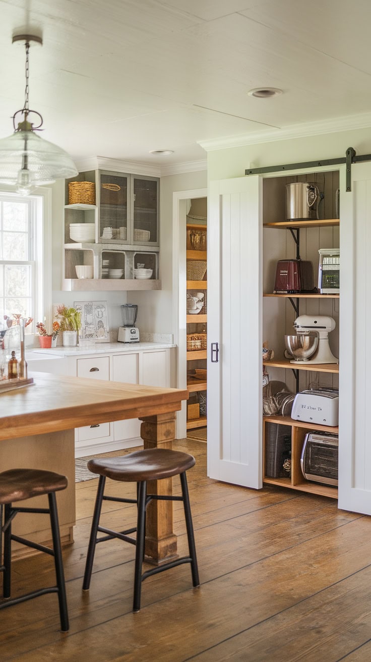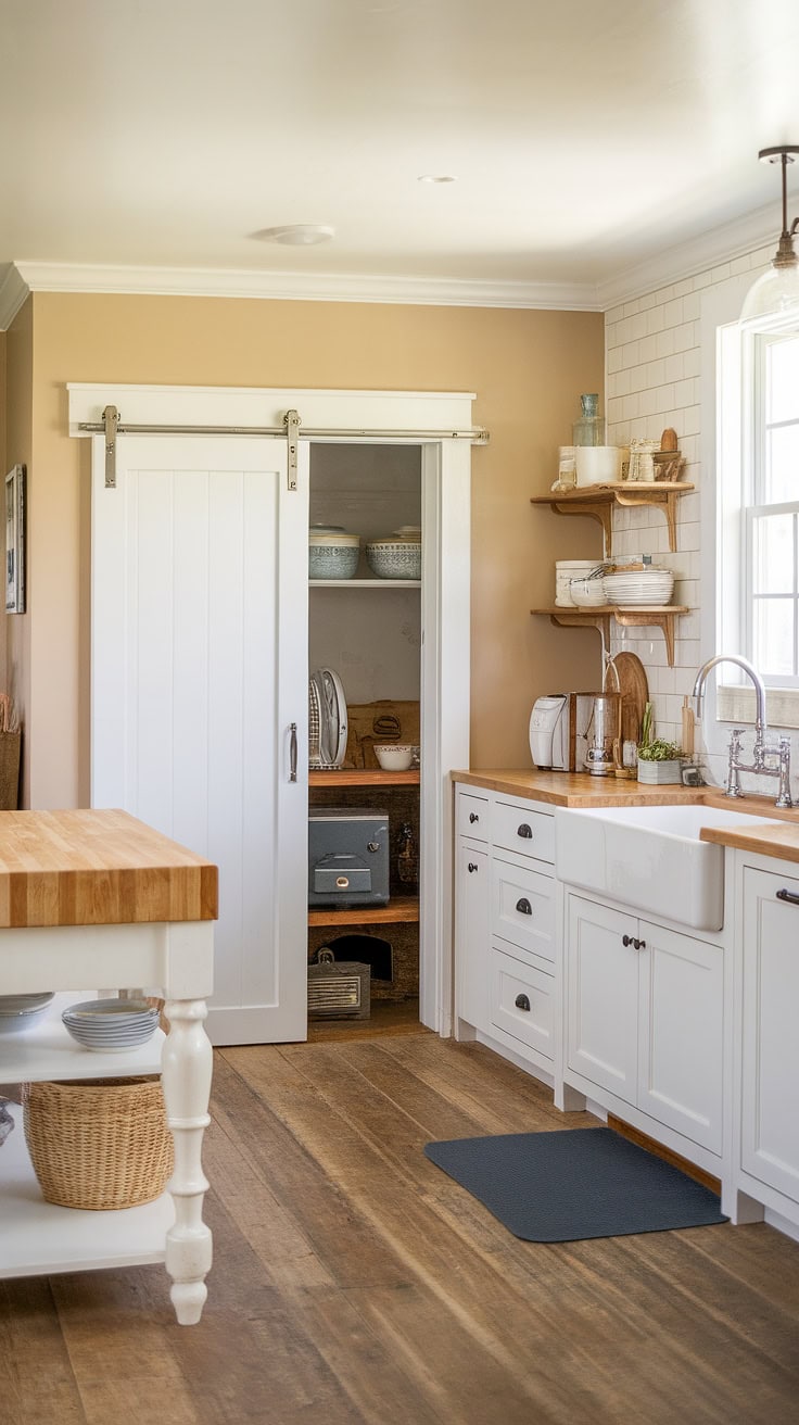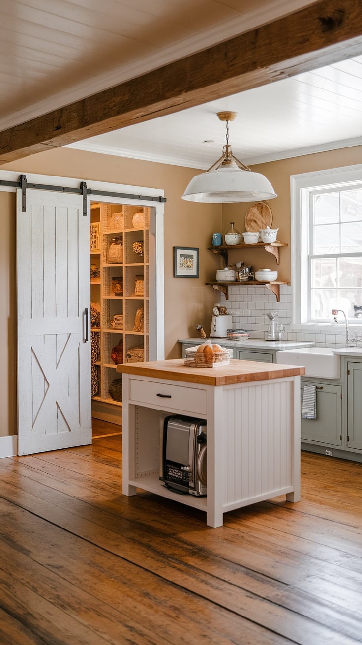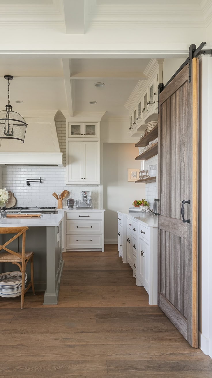 Combining warmth and practicality, this farmhouse kitchen features a white island with a butcher block top as its centerpiece. A sliding barn door conceals the appliance garage, ensuring pristine counters, while ample pantry cabinets offer generous storage—perfectly merging vintage appeal with modern needs.