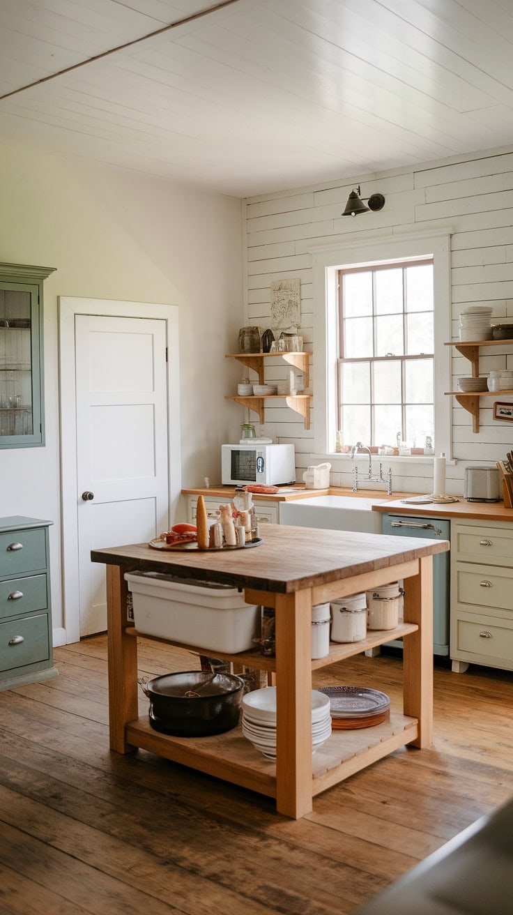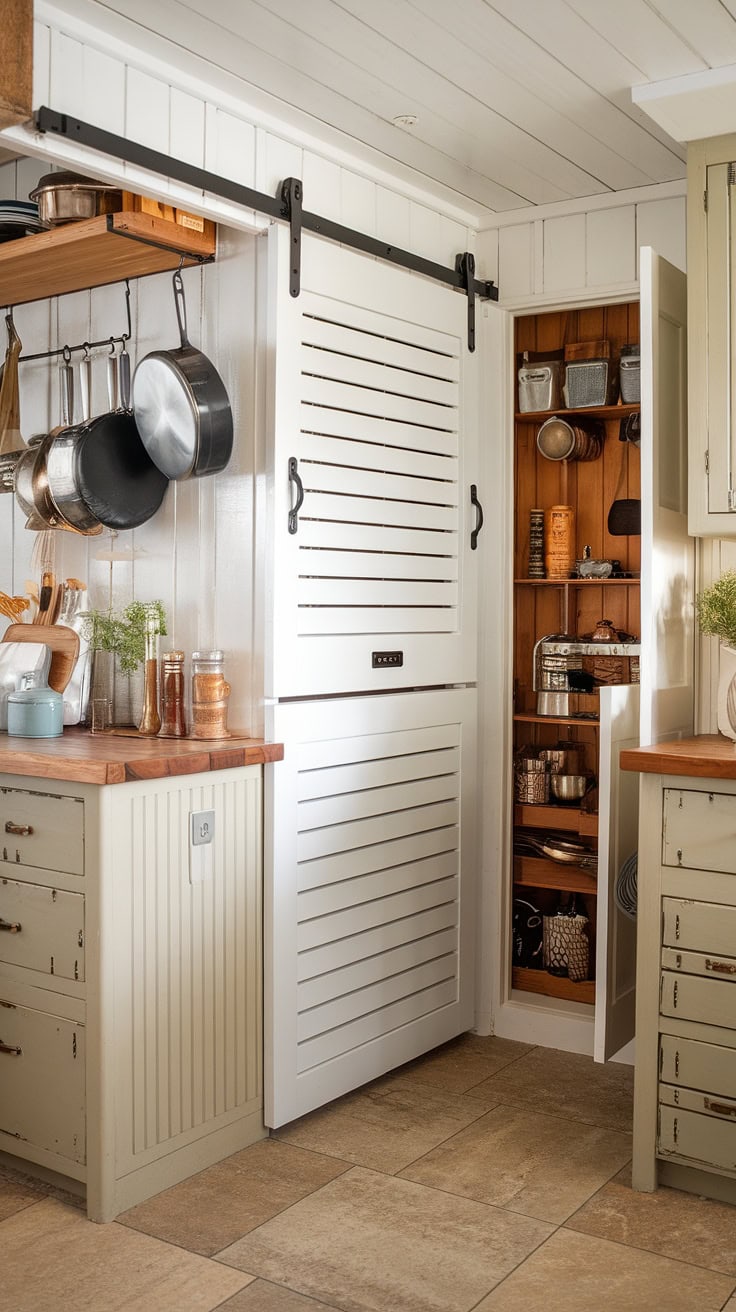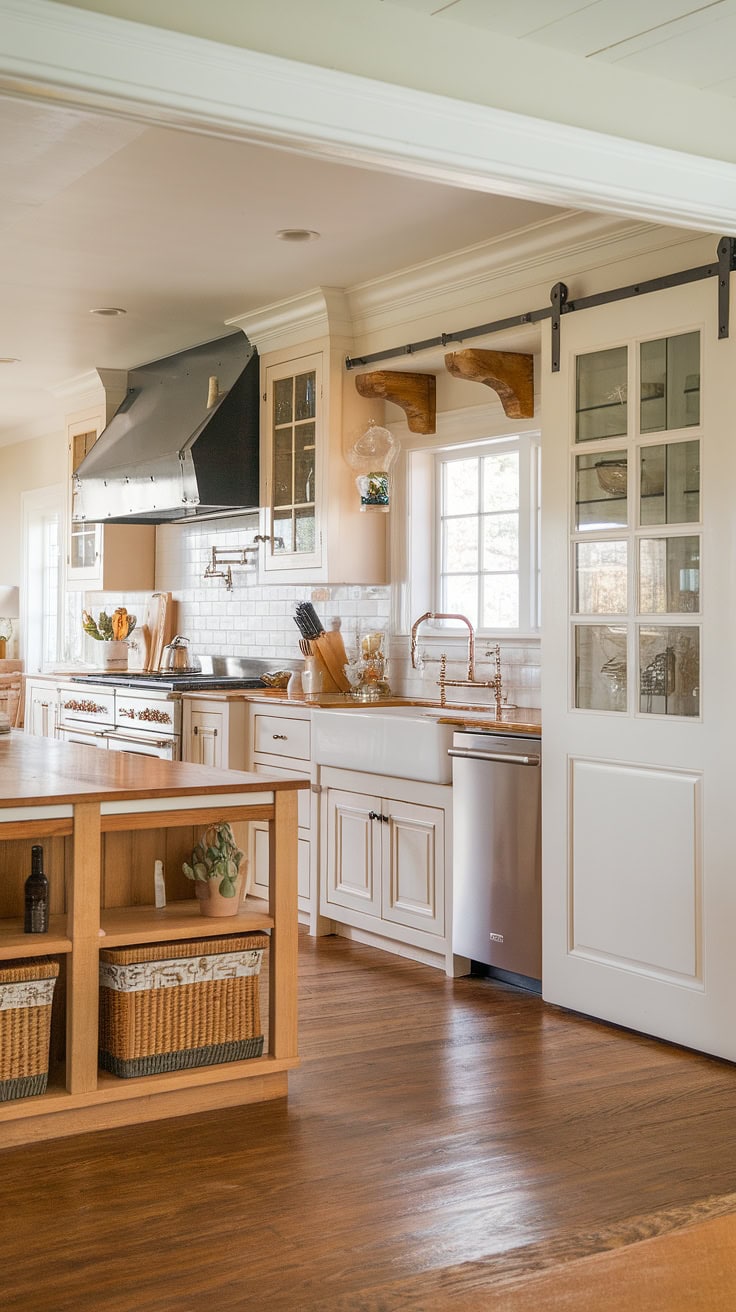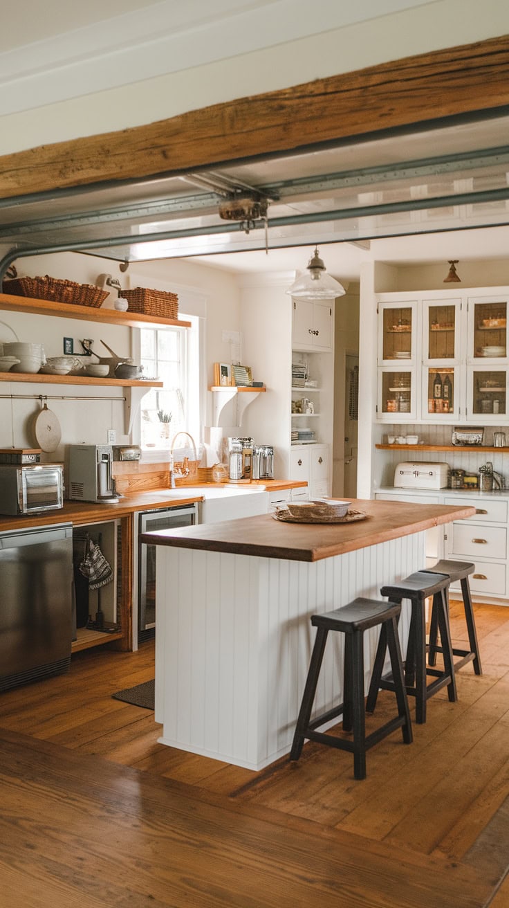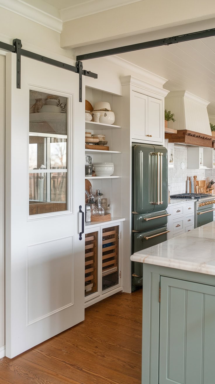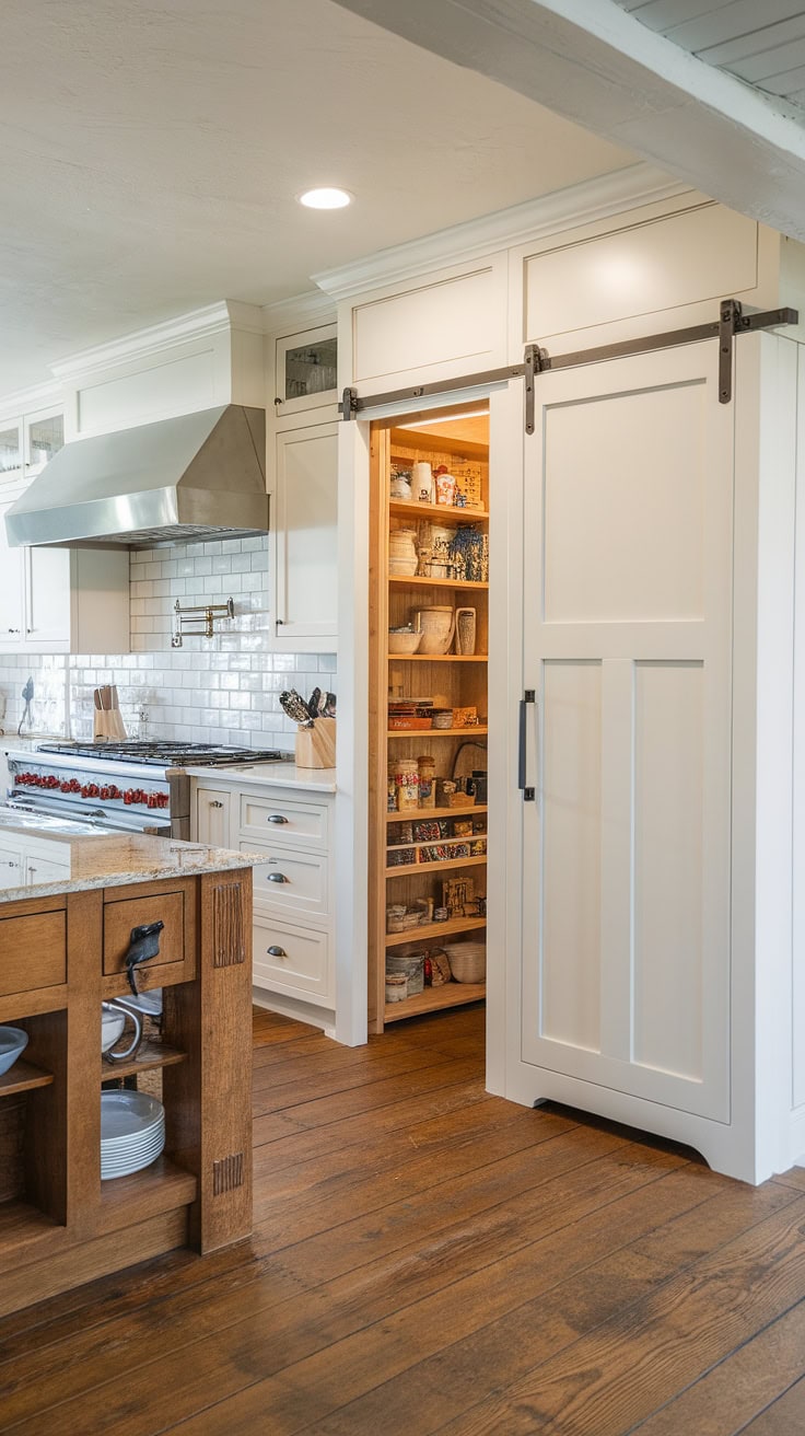 Combining warmth and practicality, this farmhouse kitchen features a white island with a butcher block top as its centerpiece. A sliding barn door conceals the appliance garage, ensuring pristine counters, while ample pantry cabinets offer generous storage—perfectly merging vintage appeal with modern needs.