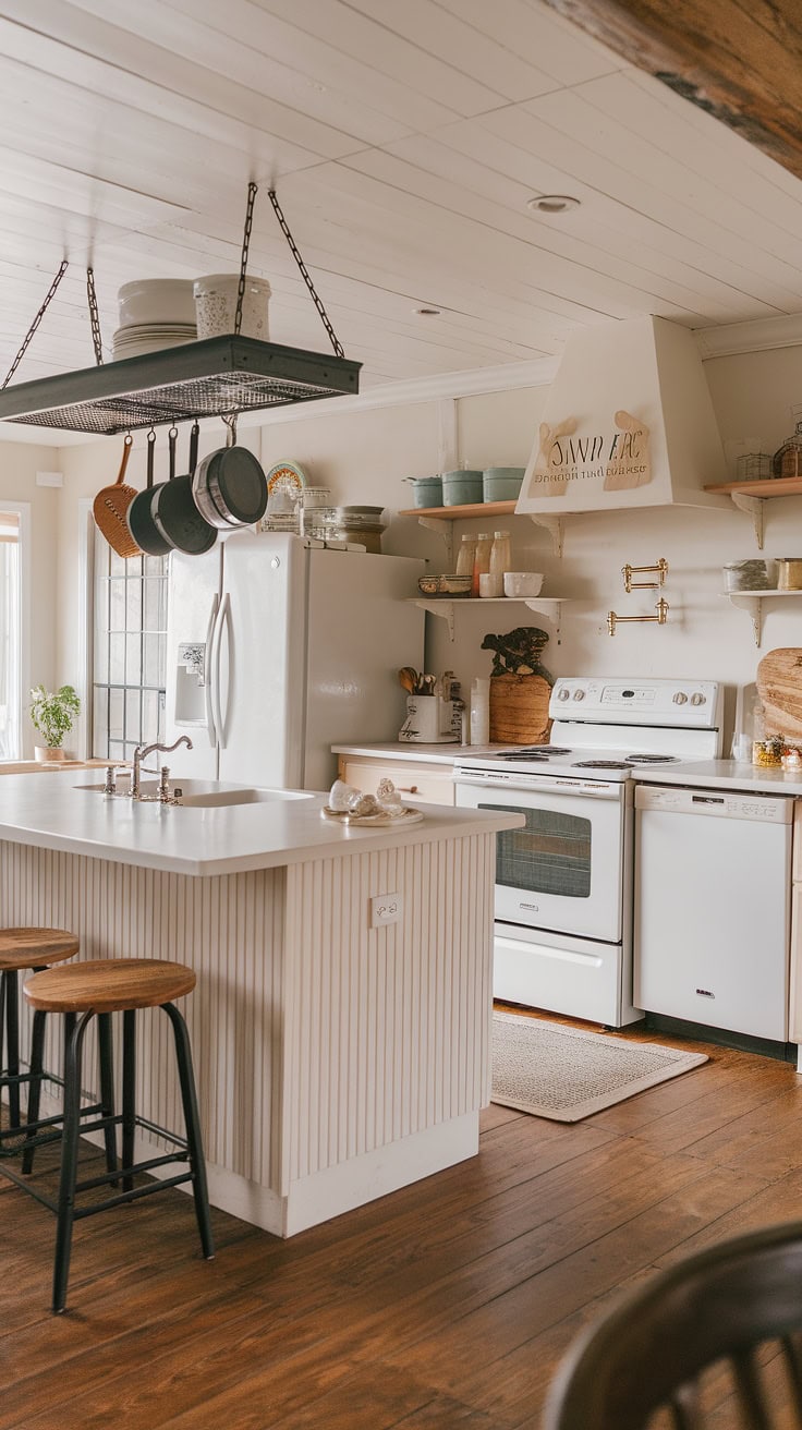 Rustic warmth meets practical storage in this farmhouse kitchen, featuring wooden pantry cabinets, a farmhouse sink, and a stove highlighted by hanging pots. An integrated kitchen garage accommodates appliances seamlessly, completing the inviting, functional interior. Browse farmhouse sinks on Amazon.