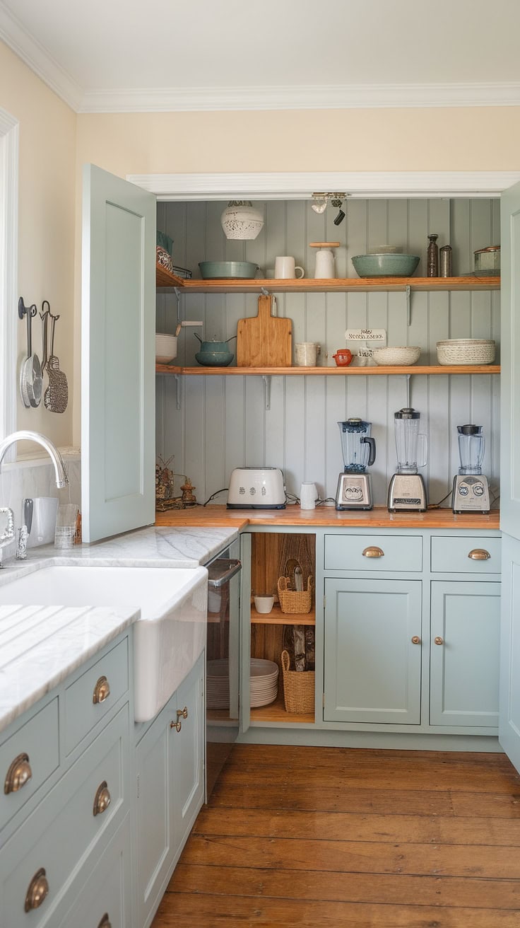 This kitchen garage cleverly conceals appliances in this charming farmhouse design. The light blue pantry cabinets contribute a gentle rustic sophistication, enhancing the kitchen’s elegant yet practical ambiance.
