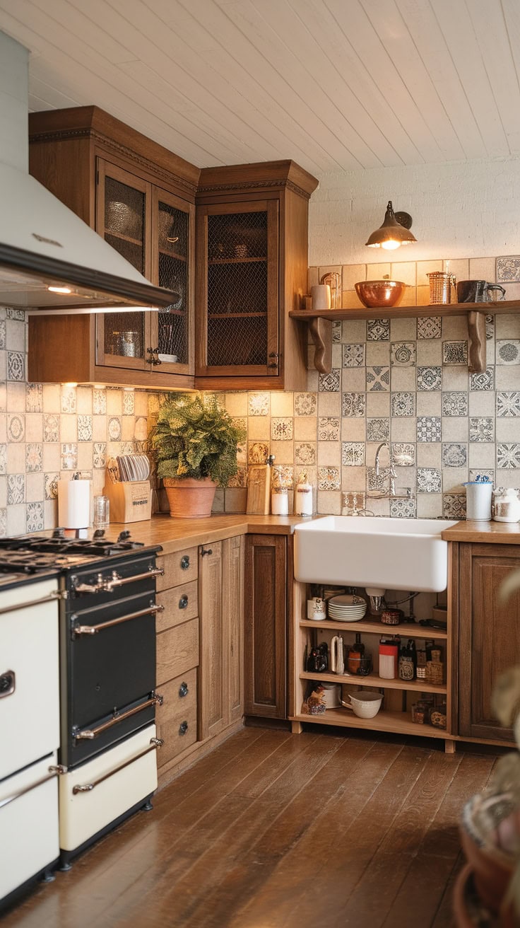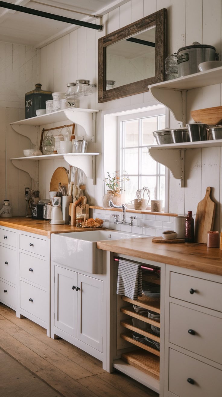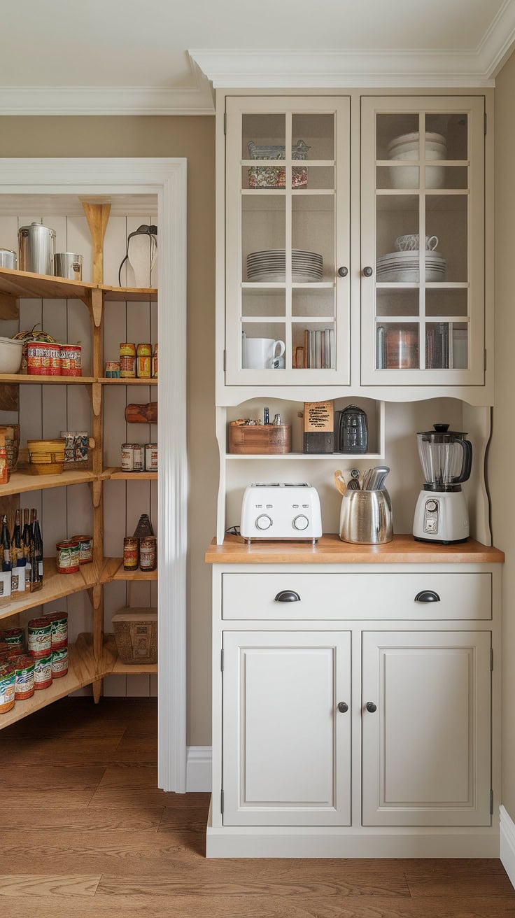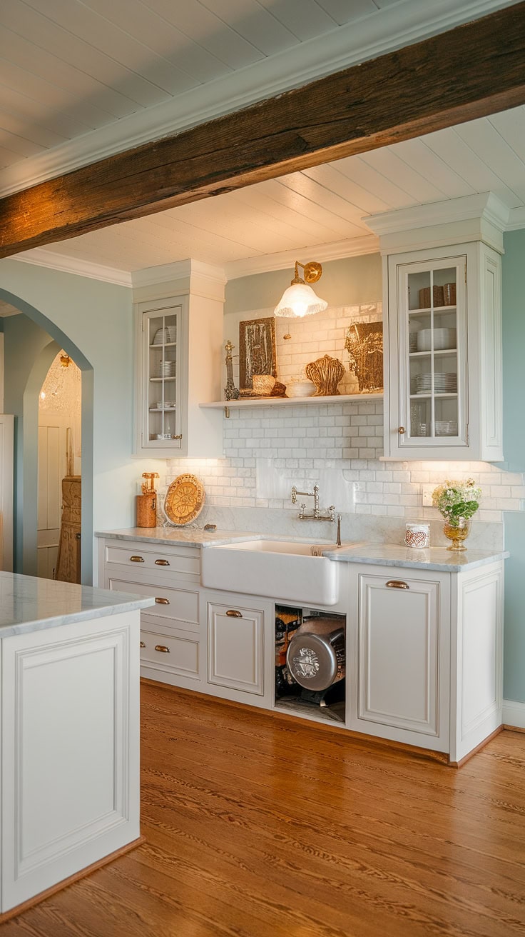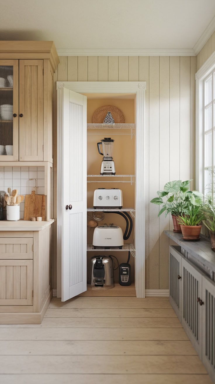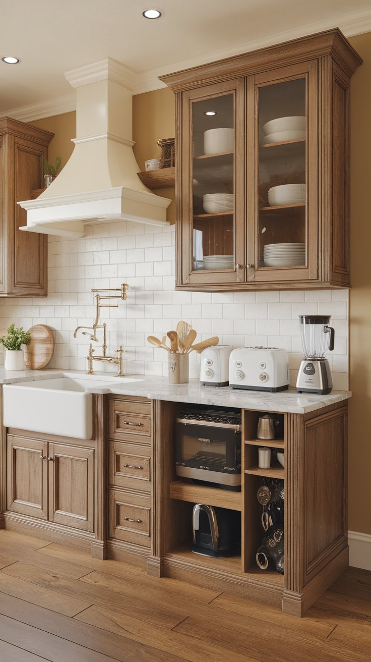 This charming farmhouse kitchen showcases a smart appliance garage, complemented by glass-front pantry cabinets and a deep farmhouse sink. The design maximizes storage while maintaining a welcoming rustic charm, enhanced with touches of greenery from potted plants.