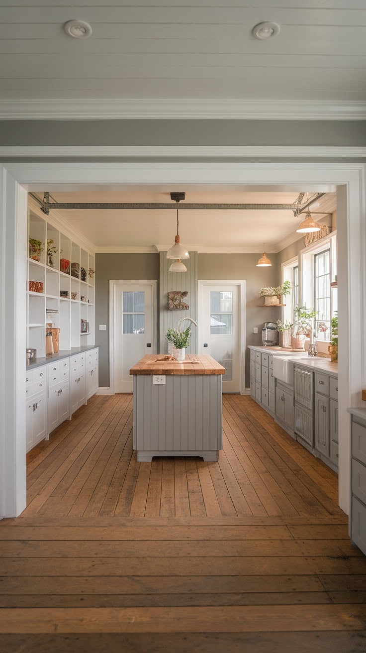 Natural light floods this inviting farmhouse kitchen, highlighting crisp white cabinetry and a butcher block island surrounded by three minimalist stools. Suspended pendant lamps bathe the space in cozy radiance. The ingeniously designed appliance garage conceals gadgets, maintaining clutter-free countertops, while generous kitchen pantry cabinets provide ample storage. A whimsically painted pale blue floor adds character, and a vintage farmhouse welcome sign completes the warm ambiance. This appliance garage effortlessly complements the farmhouse aesthetic.