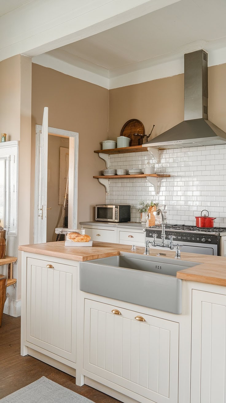 Rustic aesthetics merge with contemporary convenience in this farmhouse kitchen. An integrated kitchen garage keeps counters tidy, supported by well-sized pantry cabinets. Warm wood countertops offset neutral beige walls, inviting comfort into the heart of the home.