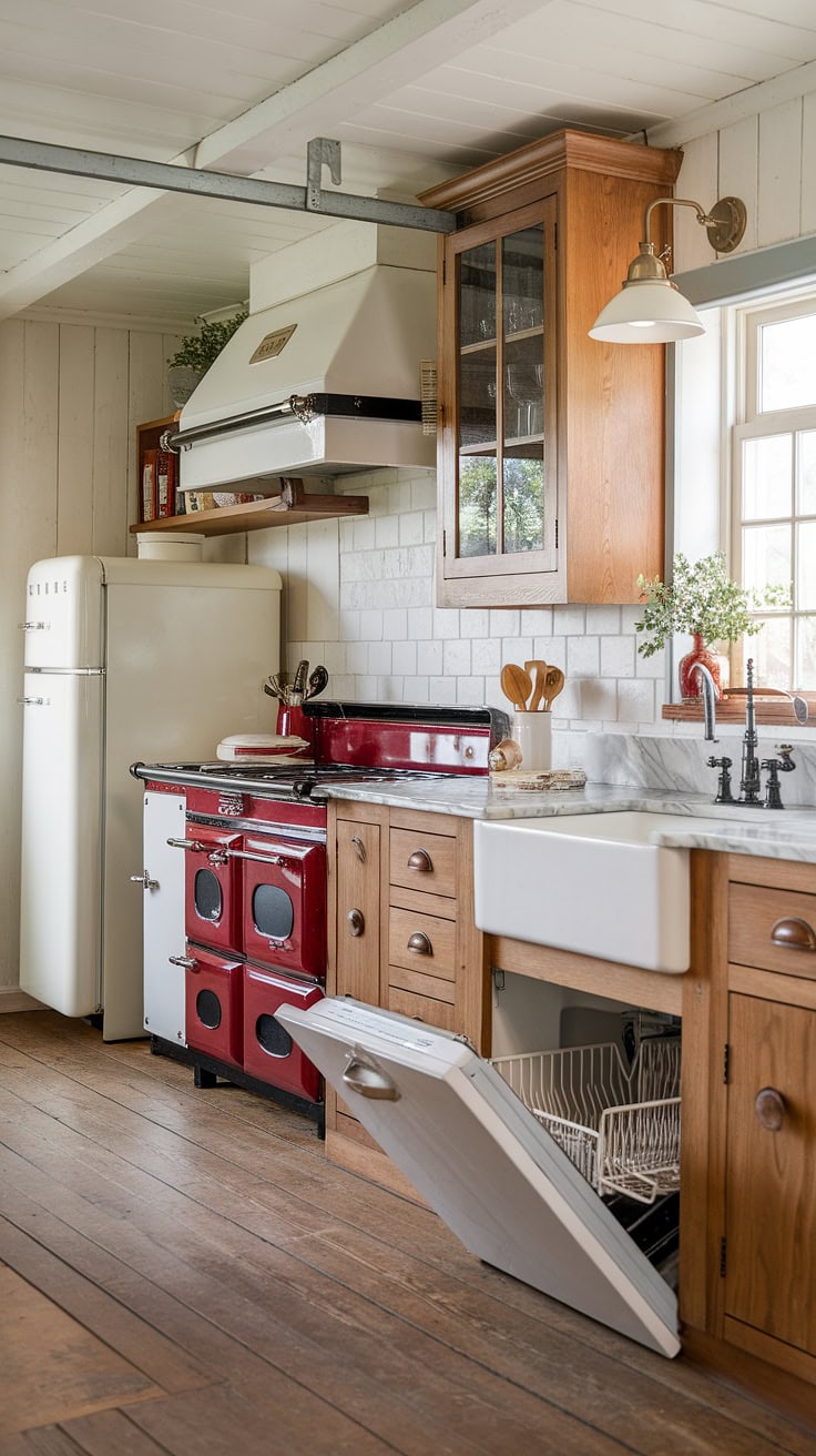 Space maximization meets style in this exemplary kitchen garage, housing appliances such as a white refrigerator, vibrant red range cooker, and white dishwasher in a clutter-free manner. Rich wood cabinetry, a farmhouse-style sink, and pendant lighting complete this thoughtfully planned kitchen interior.