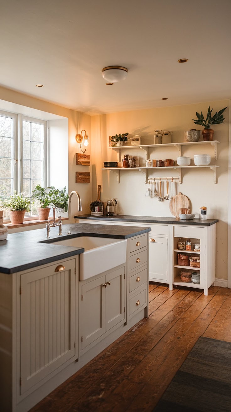 Bathed in warm lighting, this farmhouse kitchen features a spacious island with dark gray countertop and pristine white sink. Clean-lined pantry cabinets and a discreet appliance garage declutter the space, while potted plants add refreshing vibrance near the window, producing a welcoming atmosphere.