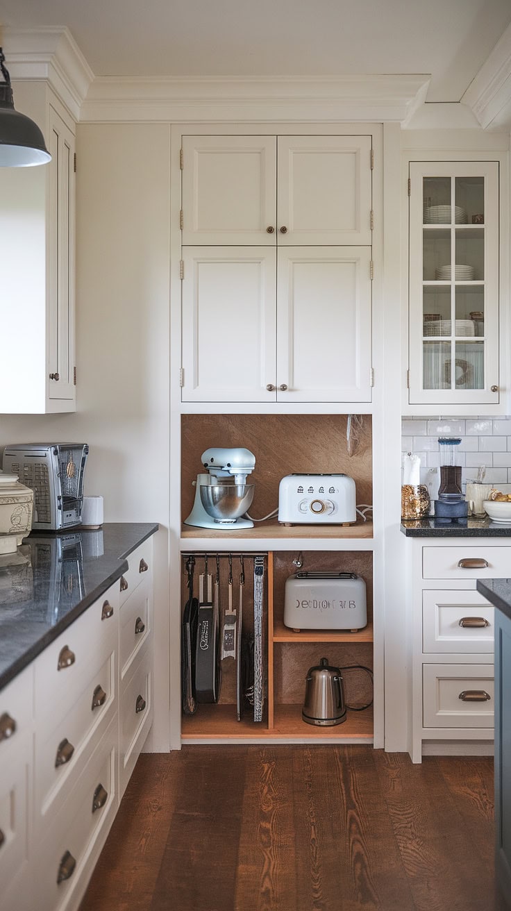 Seamlessly integrating white cabinetry with marble countertops, this kitchen appliance garage offers an elegant storage solution. Its coordinated design with white cabinetry and sophisticated pantry cabinets enhances both aesthetic appeal and functional organization.