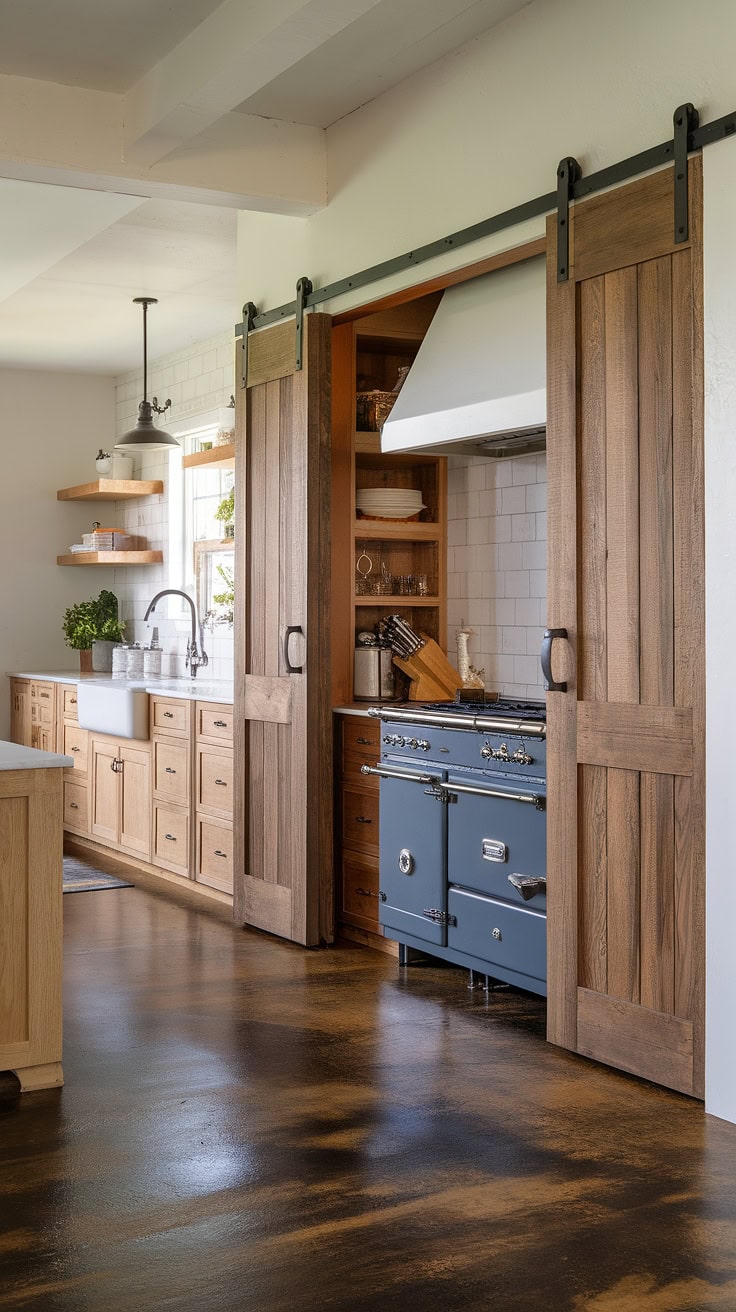 Boasting a custom kitchen garage doubling as pantry, this farmhouse kitchen blends rustic wooden cabinetry with dark concrete floors and a classic farmhouse sink, achieving a kitchen interior design that balances style with supreme functionality.