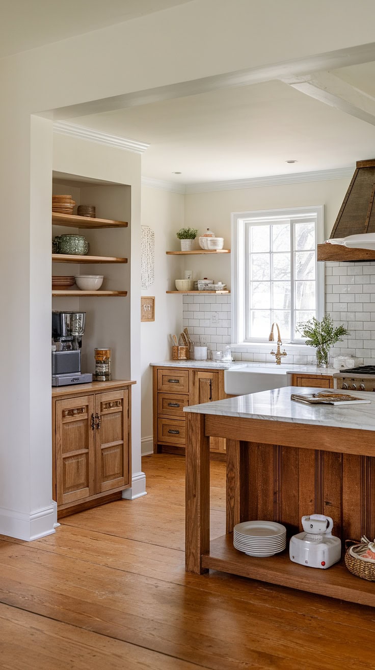 This kitchen blends rustic feel with modern storage by hiding appliances behind pristine white doors in an appliance garage. Warm wood cabinetry, marble counters, and classic farmhouse sink combine elegance with thoughtful kitchen interior design enhanced by wood floors.